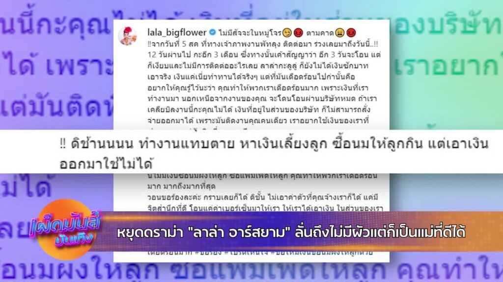 เป็นอีกหนึ่งบุคคลที่ถูกชาวเน็ตคอมเมนต์แซะแรง จนเกิดกระแสดราม่ามาตลอดสำหรับ “ลาล่า อาร์สยาม” ล่าสุดมีเรื่องให้ปวดหัว จนเจ้าตัวเอ่ยปากไม่อยากพูดถึง เพราะกลัวลูกชายหรือน้องริชาร์ด (ลูกบุญธรรม) โตขึ้นและได้เห็นข่าวจะรู้สึกแย่ จากกระแสที่ถูกชาวเน็ตแซะหาว่าตัวเองโกหกว่าตนมีลูก แต่แท้จริงแล้วเป็นลูกของน้องสาว บางคนก็แซะแรงว่า ทำไมดาราชอบไปให้คนอื่นท้องให้ แล้วมโนว่าเป็นลูกของตัวเอง เป็นต้น งานนี้ทางรายการ เผ็ดมันส์บันเทิง ทางสถานีโทรทัศน์ช่อง8 จึงไม่รอช้า รีบต่อสายตรงไปหาเจ้าตัวในทันที