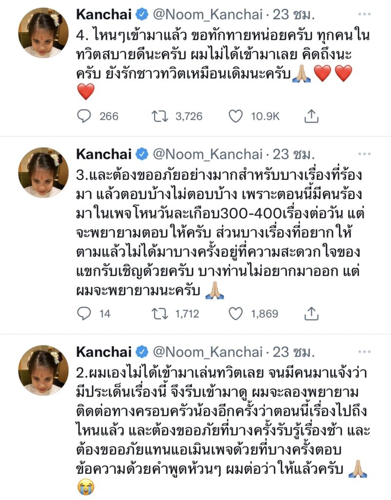 2.ผมเองไม่ได้เข้ามาเล่นทวิตเลย จนมีคนมาแจ้งว่ามีประเด็นเรื่องนี้ จึงรีบเข้ามาดู ผมจะลองพยายามติดต่อทางครอบครัวน้องอีกครั้งว่าตอนนี้เรื่องไปถึงไหนแล้ว และต้องขออภัยที่บางครั้งรับรู้เรื่องช้า และต้องขออภัยแทนแอดมินเพจด้วยที่บางครั้งตอบข้อความด้วยคำพูดห้วนๆ ผมต่อว่าให้แล้วครับ