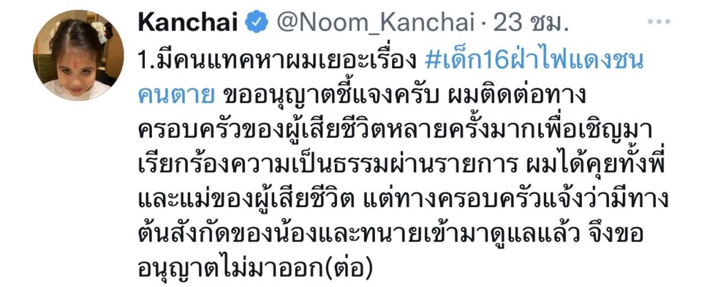 1.มีคนแท็กหาผมเยอะเรื่อง #เด็ก16ฝ่าไฟแดงชนคนตาย ขออนุญาตชี้แจงครับ ผมติดต่อทางครอบครัวของผู้เสียชีวิตหลายครั้งมากเพื่อเชิญมาเรียกร้องความเป็นธรรมผ่านรายการ ผมได้คุยทั้งพี่และแม่ของผู้เสียชีวิต แต่ทางครอบครัวแจ้งว่ามีทางต้นสังกัดของน้องและทนายเข้ามาดูแลแล้ว จึงขออนุญาตไม่มาออก