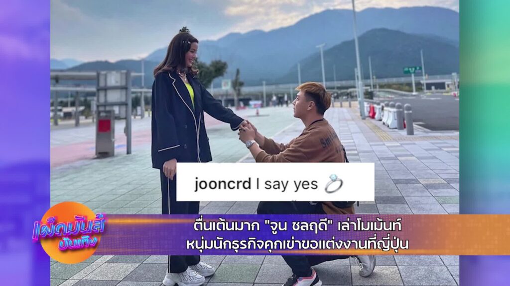 ขึ้นแท่นเป็นเจ้าสาวป้ายแดงไปเป็นที่เรียบร้อยสำหรับนางเอกสาวสุดฮอตจากสถานีโทรทัศน์ช่อง 8 อย่าง “จูน–ชลฤดี อมรลักษณ์” ที่ล่าสุด (27 ตุลาคม 2565) หลังโดนแฟนหนุ่มนักธุรกิจนอกวงการ “คุณเติ้ง–พิภูษณ คุณคุณูปการนันท์” ทำเซอร์ไพรส์ คุกเข่าขอแต่งงาน แดนไกลถึงประเทศญี่ปุ่น ซึ่งทั้งคู่ได้ศึกษาดูใจกันนานกว่า 7 ปี โดยงานนี้รายการเผ็ดมันส์บันเทิง จึงไม่รอช้า ต่อสายตรงคุยกับสาวจูนเป็นที่แรก หลังจากที่สาวจูน ได้โพตส์โมเมนต์สุดโรแมนติกผ่านอินสตาแกรมของเธอ พร้อมแคปชันว่า “I Say Yes” ตกแต่งอีโมจิรูปแหวน ทำเอาเพื่อนทั้งใน และนอกวงการบันเทิง พร้อมแฟนคลับ ต่างแห่มาร่วมแสดงความยินดี เรื่องราวจะโรแมนติก แสนหวานขนาดไหน มาฟังความรู้สึกสุดทัชใจของจูนครั้งนี้กัน