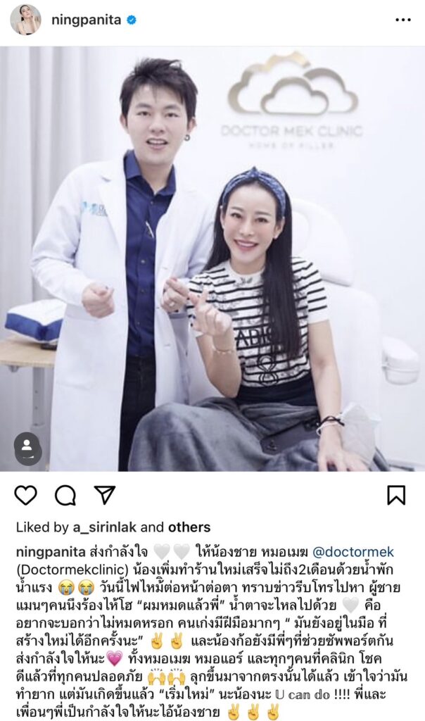 จากข่าวไฟไหม้คลินิกดัง Doctor Mek Clinic ณ สเตเดียมวัน พี่สาวอย่าง หนิง ปณิตา ต่อสายตรงถึงหมอเมฆ พร้อมโพสต์ให้กำลังใจผ่านโซเชียลมีเดียและยืนยันพร้อมซัพพอร์ตด้วยข้อความว่า…