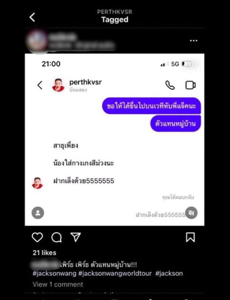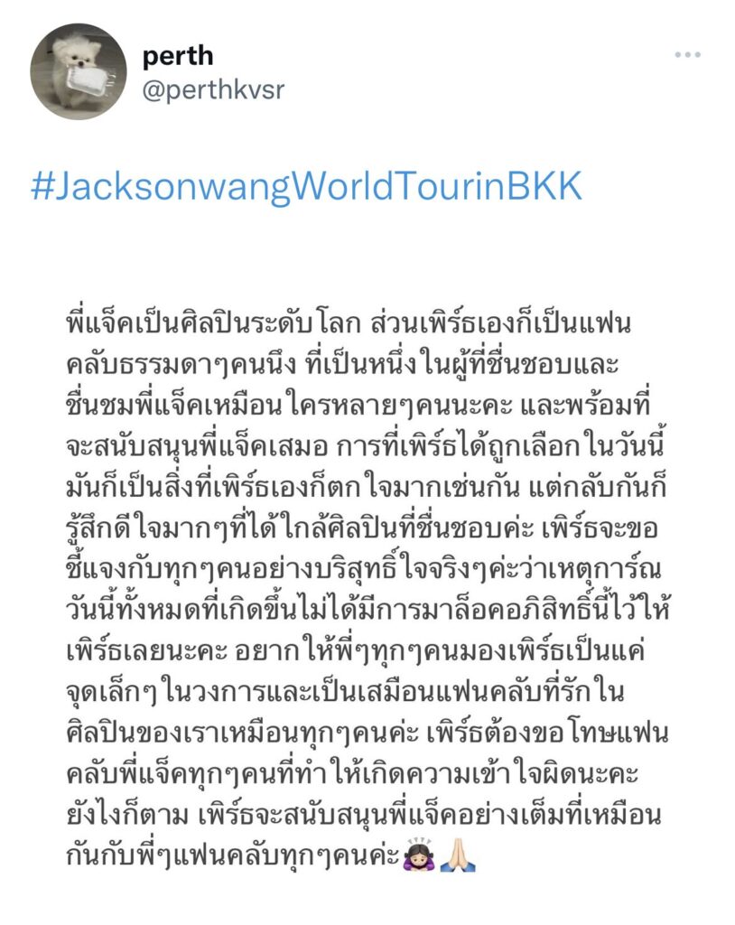 ล่าสุด เพิร์ธ หวั่นคนเข้าใจผิดมากกว่านี้ รีบออกมาชี้แจงทันทีว่า “พี่แจ็คเป็นศิลปินระดับโลก ส่วนเพิร์ธเองก็เป็นแฟนคลับธรรมดาๆคนนึง ที่เป็นหนึ่งในผู้ที่ชื่นชอบและชื่นชมพี่แจ็คเหมือนใครหลายๆคนนะคะ และพร้อมที่จะสนับสนุนพี่แจ็คเสมอ การที่เพิร์ธได้ถูกเลือกในวันนี้มันก็เป็นสิ่งที่เพิร์ธเองก็ตกใจมากเช่นกัน แต่กลับกันก็รู้สึกดีใจมากๆที่ได้ใกล้ศิลปินที่ชื่นชอบค่ะ เพิร์ธจะขอชี้แจงกับทุกๆคนอย่างบริสุทธิ์ใจจริงๆค่ะว่าเหตุการ์ณวันนี้ทั้งหมดที่เกิดขึ้นไม่ได้มีการมาล็อคอภิสิทธิ์นี้ไว้ให้เพิร์ธเลยนะคะ อยากให้พี่ๆทุกๆคนมองเพิร์ธเป็นแค่จุดเล็กๆในวงการและเป็นเสมือนแฟนคลับที่รักในศิลปินของเราเหมือนทุกๆคนค่ะ เพิร์ธต้องขอโทษแฟนคลับพี่แจ็คทุกๆคนที่ทำให้เกิดความเข้าใจผิดนะคะยังไงก็ตาม เพิร์ธจะสนับสนุนพี่แจ็คอย่างเต็มที่เหมือนกันกับพี่ๆแฟนคลับทุกๆคนค่ะ“