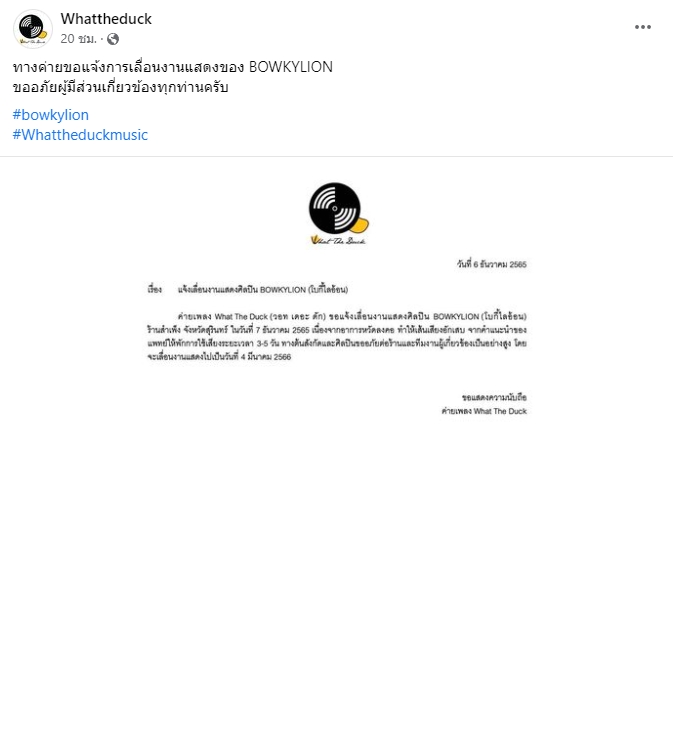 พร้อมกเขียนแคปชั่นเพิ่มเติมว่า “ทางค่ายขอแจ้งการเลื่อนงานแสดงของ BOWKYLION ขออภัยผู้มีส่วนเกี่ยวข้องทุกท่านครับ”