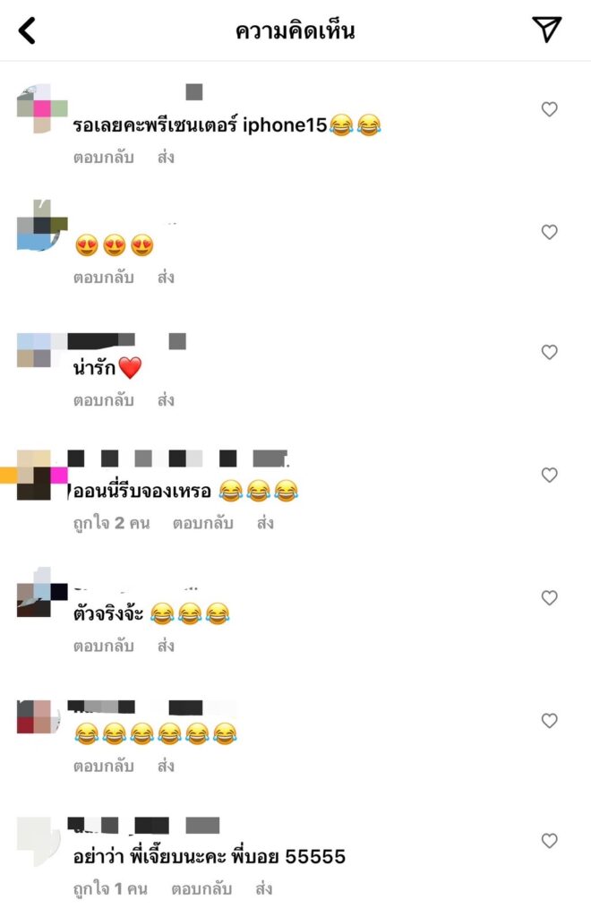 ชาวเน็ตต่างเข้ามาแซวเจี๊ยบ พิจิตตรา กันยกใหญ่เช่น iphone15 ราคาอยู่ประมาณกันยาปีหน้าค่ะข่าวบอกอย่างนั้น😂เอา14ไปก่อน‼️🤣, วิก็วิเถอะ เจอเจี๊ยบใหญ่กว่าแน่นอนค่ะ, เจี๊ยบผู้มาก่อนกาล, รักเธอคนนี้ เจี๊ยบผู้ไม่เคยทำให้ผิดหวัง