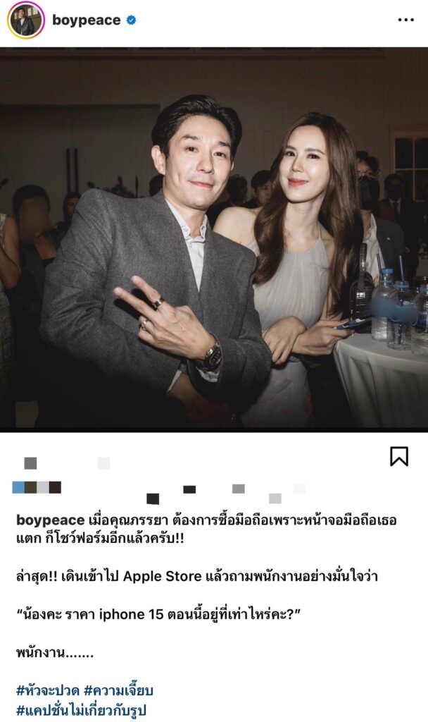 แซวภรรยาไม่แผ่ว สำหรับ บอย อนุวัฒน์ ที่มักจะนำเรื่องราว #ความเจี๊ยบ ของศรีภรรยา เจี๊ยบ พิจิจตรา มาแฉ เอ้ย มาโพสต์ให้แฟนๆอมยิ้มอยู่บ่อยครั้ง โดยล่าสุด ได้โพสต์รูปคู่พร้อมเขียนแคปชั่นแฉความโก๊ะของ สาวเจี๊ยบ ขณะไปเลือกซื้อโทรศัพท์เครื่องใหม่ ระบุข้อความว่า “เมื่อคุณภรรยา ต้องการซื้อมือถือเพราะหน้าจอมือถือเธอแตก ก็โชว์ฟอร์มอีกแล้วครับ!!