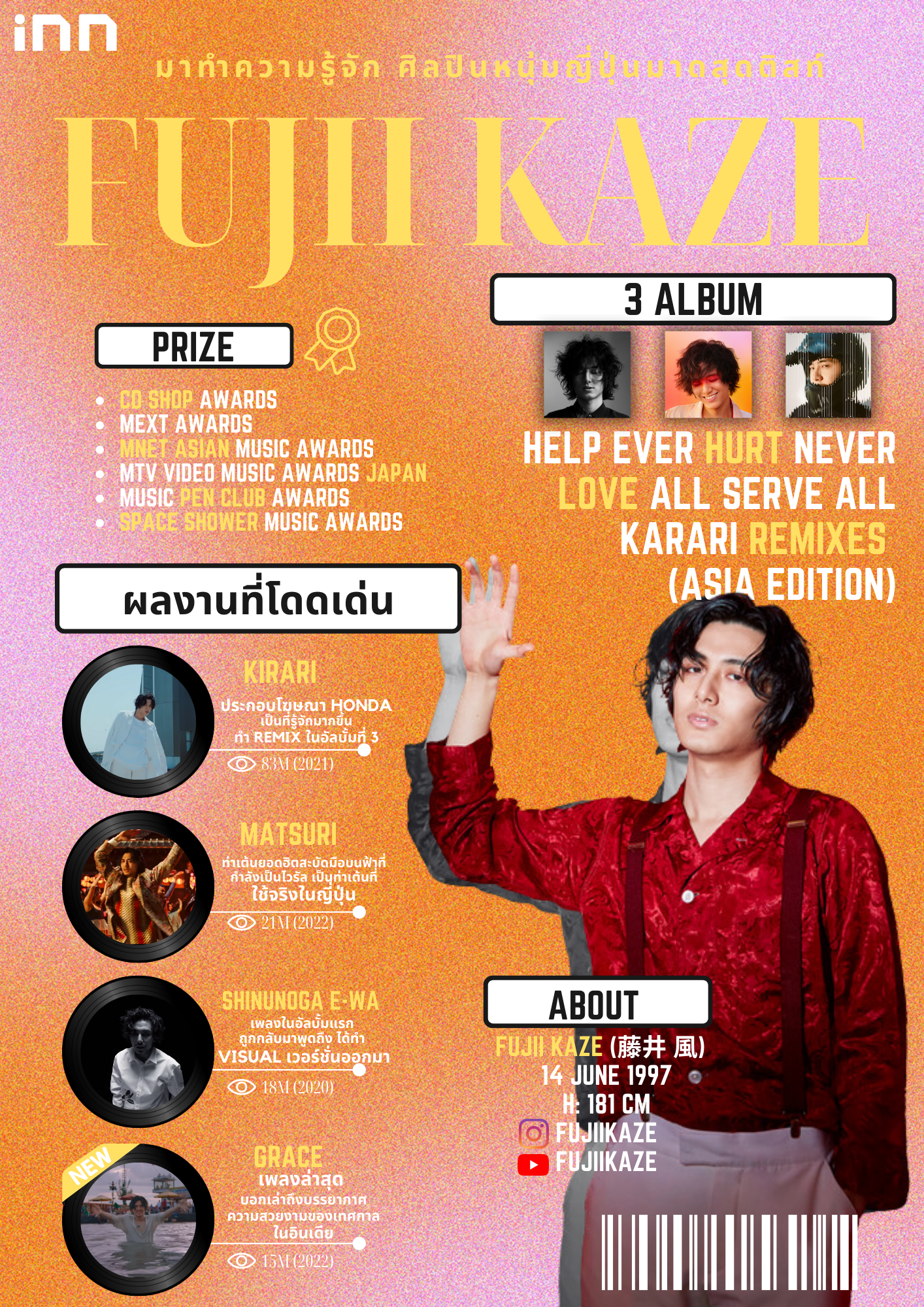 ดูทรงว่าปีนี้จะเป็นปีของหนุ่มญี่ปุ่นคนนี้ซะแล้ว เพราะเพลงเขาเนี่ยมีทั้งคุณภาพ ความสดใหม่ กลิ่นอายความเป็นญี่ปุ่นที่รวมดนตรีหลากหลายสไตล์ตามแบบของ Fujii Kaze อยากรูัว่าหลายสไตล์ยังไง แนะนำอัลบั้มสุดพิเศษ “Karari Remixes (Asia Edition)” ที่ทั้งแต่งเพลงเอง เรียบเรียงเอง รวบรวมดนตรีทุกแนวในเพลงเดียว ความรู้สึกตอนฟังที่ต่างกันบอกเลยฟินแน่นอน ทั้งเก่งและมีความสามารถ ทุกคนต้องลองได้ฟังสักครั้งแล้วจะต้องติดใจ