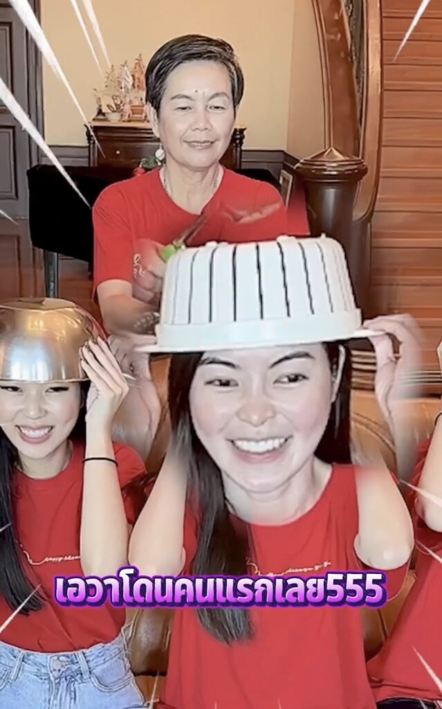 คุณแม่ : ใช้ตะหลิวเคาะไปที่หัวของเอวา (เอวายิ้ม) เพราะโดนเป็นคนแรก