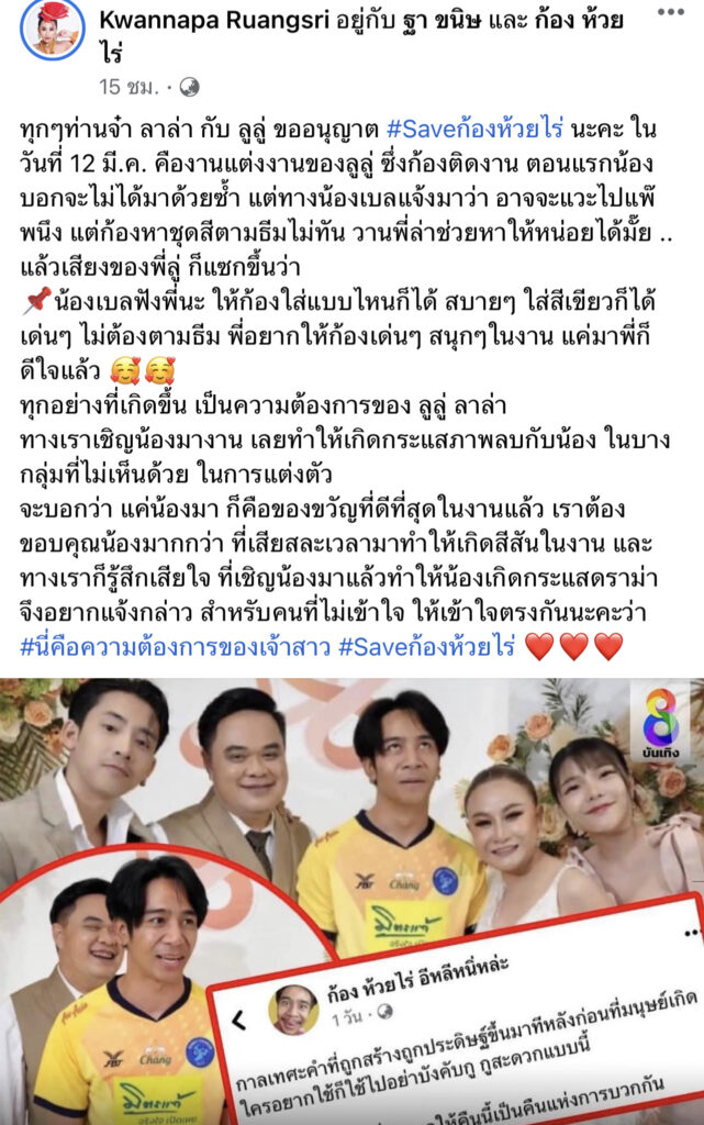 เราต้องขอบคุณน้องมากกว่า ที่เสียสละเวลามาทำให้เกิดสีสันในงาน และทางเราก็รู้สึกเสียใจ ที่เชิญน้องมาแล้วทำให้น้องเกิดกระแสดราม่า จึงอยากแจ้งกล่าว สำหรับคนที่ไม่เข้าใจ ให้เข้าใจตรงกันนะคะว่า #นี่คือความต้องการของเจ้าสาว #Saveก้องห้วยไร่”
