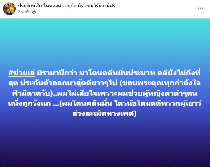 ซึ่งภายบหลัง นายห้างประจักษ์ชัย ก็ได้โพสต์ข้อความถึงคดีดังกล่าวผ่านเฟซบุ๊กส่วนตัวระบุว่า “#ช่วยเอ๋ มิรามาปีกว่า มาโดนคดีหมิ่นประมาท คดียังไม่ถึงที่สุด ประกันตัวออกมาสู้คดียาวๆไป (ขอบพระคุณทุกกำลังใจ ฟ้ามีตาครับ)..ผมไม่เสียใจเพราะผมช่วยผู้หญิงตาดำๆคนหนึ่งถูกรังเเก …(ผมโดนคดีหมิ่น ใครน้อโดนคดีพรากผู้เยาว์ ล่วงละเมิดทางเพศ)”
