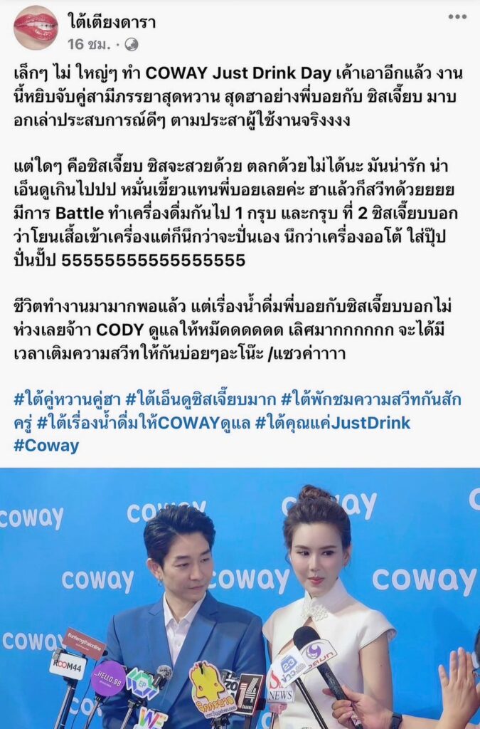 ทำเอาแฟนๆและผู้ไปร่วมงานถึงกับอมยิ้มกันเป็นแถว สำหรับความน่ารักของคู่รัก เจี๊ยบ พิจิตตรา และ บอย อนุวัฒน์ ที่ล่าสุดได้ควงกันออกงาน COWAY Just Drink Day มาบอกเล่าประสบการณ์ดีๆ ตามประสาผู้ใช้งานจริง ซึ่งบรรยากาศภายในงานอบอวลไปด้วยรอยยิ้มและความสนุกตามสไตล์ของคู่รักพลังบวก จนทำเอาเพจดังถึงกับอดใจที่จะแซวความน่าเอ็นดูของทั้งคู่ไม่ได้แบบนี้