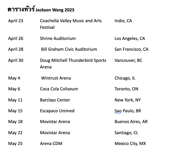 แจ็คสัน พร้อมเปิดฉากการทัวร์คอนเสิร์ตครั้งแรกในอเมริกาเหนือในฐานะศิลปินเดี่ยวกับ MAGIC MAN World Tour ในวันพุธที่ 26 เมษายนนี้ ที่ Shrine Expo Hall ของลอสแอนเจลิส จากนั้นเขาจะเดินสายไปเสิร์ฟความสนุกใน 6 เมืองใหญ่ ได้แก่ ซานฟรานซิสโก และ ชิคาโก ก่อนปิดฉากที่ Barclays Center นิวยอร์ก ในวันที่ 11 พฤษภาคมนี้ ที่สำคัญ แจ็คสัน ยังเตรียมเพิ่มรอบการแสดงในแถบอเมริกาใต้ในปีนี้อีกด้วย เช็คตารางของวันแสดงทั้งหมดได้ที่ด้านล่าง และสามารถเข้าไปดูข้อมูลเพิ่มเติมได้ที่ tour.jackson-wang.com.