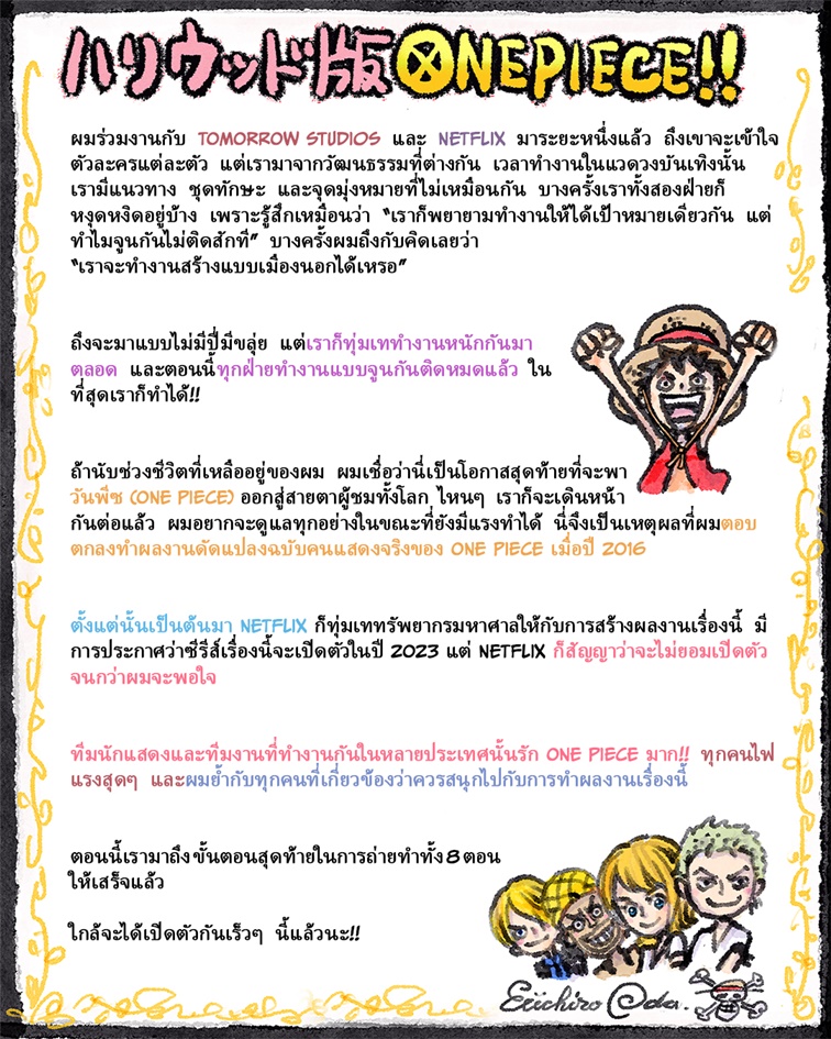 Netflix และ Shueisha เปิดจดหมายพิเศษของ อาจารย์เออิจิโระ โอดะ ผู้สร้างมังงะระดับตำนานเรื่อง ONE PIECE เพื่ออัปเดตแฟนๆ ถึงความคืบหน้าของซีรีส์ ONE PIECE (วันพีซ) ฉบับคนแสดง โดยในจดหมาย อาจารย์โอดะ ย้ำถึงการทำงานอย่างหนักของทีมงานทุกฝ่ายที่ต่างก็เต็มที่ และตั้งใจทำงานร่วมกันอย่างไม่หยุดหย่อน พร้อมเล่าต่อว่า