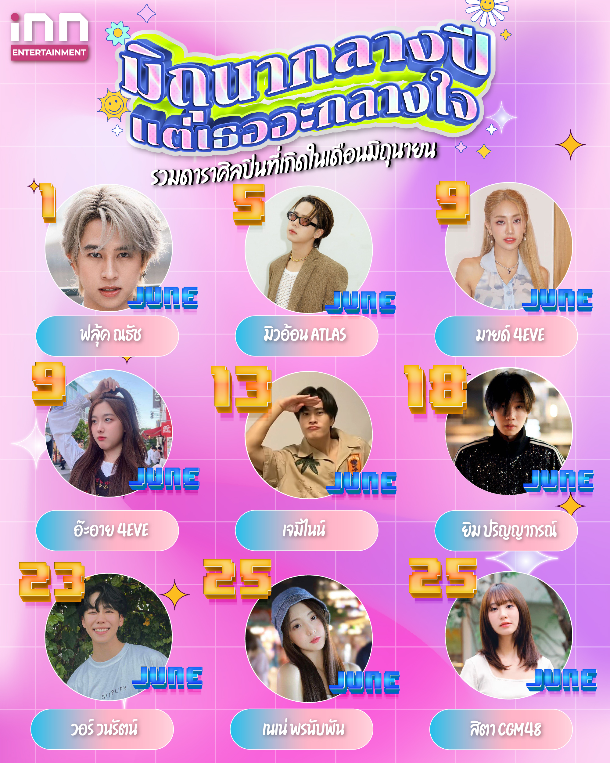 รวมศิลปิน-นักแสดงที่เกิดในเดือนมิถุนายน วันสำคัญทั้งที เราขอเป็นส่วนหนึ่งที่จะช่วยส่งต่อความรัก เพื่อเป็นของขวัญให้กับศิลปินและนักแสดงคนโปรดของคุณ โดยหากมีโปรเจกต์ต่างๆ สามารถทักมาที่ iNN ได้เลย เรายินดีที่จะประชาสัมพันธ์ให้ฟรี ไม่มีค่าใช้จ่าย