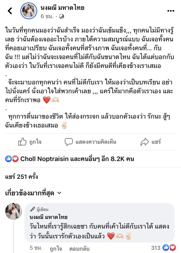 “ในวันที่ทุกคนมองว่าฉันสำเร็จ มองว่าฉันเข้มแข็ง,,, ทุกคนไม่มีทางรู้เลย ว่าฉันต้องเจออะไรบ้าง ภายใต้ความสมบูรณ์แบบ ฉันเจอทั้งคนที่คอยเอาเปรียบ ฉันเจอทั้งคนที่สร้างภาพ ฉันเจอทั้งคนที่… กับฉัน !!! แต่ไม่ว่าฉันจะเจอคนที่ไม่ดีกับฉันขนาดไหน ฉันได้แต่บอกกับตัวเองว่า ในวันที่เราเจอคนไม่ดี ก็ยังมีคนดีที่เคียงข้างเราเสมอ จ๊ะจะมาบอกทุกคนว่า คนที่ไม่ดีกับเรา ให้มองว่าเป็นบทเรียน อย่าไปนั่งแคร์ นั่งเอาใจใส่พวกเค้าเลย ,,, แคร์ให้มากคือตัวเราเอง และคนที่รักเราพอ ทุกการตื่นมาของชีวิต ให้ส่องกระจก แล้วบอกตัวเองว่า รักนะ สู้ๆ ฉันเคียงข้างเธอเสมอ และ วันไหนที่เรารู้สึกเฉยชา กับคนที่เขาไม่ดีกับเราได้ แสดงว่า วันนั้นเรารักตัวเอง”