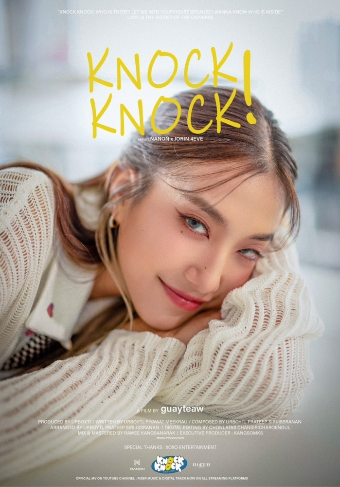 ครั้งแรกกับการร่วมงานของ “NANON” (นนน-กรภัทร์ เกิดพันธุ์) จาก “RISER MUSIC” และ “JORIN” (โจริญ คัมภีรพันธุ์) หนึ่งในสมาชิกวง 4EVE ที่มาร่วมฟีทเจอริ่งซิงเกิ้ลใหม่สุดคิ้วท์ “KNOCK KNOCK” แนวเพลง Pop ผสม Hip-Hop ที่มีเนื้อหาน่ารักๆ เล่าเรื่องของความรัก ที่แอบเก็บซ่อนไว้ เพื่อรอใครสักคนมาเปิดใจด้วยจังหวะ “knock knock” โดยได้เจ้าพ่อเพลง T-Pop อย่าง “URBOYTJ” (เต๋า-จิรายุทธ ผโลประการ) มานั่งแท่นโปรดิวเซอร์เพลงนี้ให้อย่างลงตัว แถมยังมีท่าเต้นน่ารักๆ จาก “NANON-JORIN” ให้แฟนๆ ได้เต้นตามกันอีกด้วย รับรองว่าจะอมยิ้มไปกับพวกเขาแน่นอน