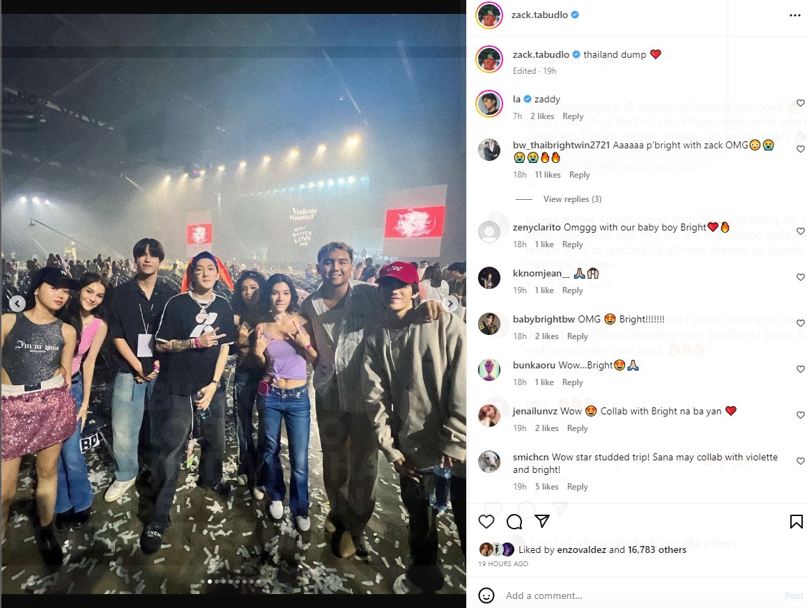 และเมื่อสัปดาห์ที่ผ่านมานี้ “Zack Tabudlo” ได้มาเยือนเมืองไทย เข้าสตูดิโอทำเพลงและร่วมชม The Concert presents Violette Wautier “YOU BETTER LOVE ME CONCERT” คอนเสิร์ตเดี่ยวครั้งแรกของเพื่อนศิลปินสาว“วิโอเลต วอเทียร์” อีกด้วย ผลงานและความสำเร็จเหล่านี้ยังชี้ชัดด้วยว่า ปี 2023 คือปีทองของ “Zack Tabudlo” และเตรียมติดตามผลงานเพลงอันหน้าตื่นเต้นของเขาได้ตลอดปีนี้