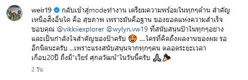 โดยเจ้าตัวได้โพสต์แจ้งข่าวดีผ่านอินสตราแกรมส่วนตัวว่า “กลับเข้าสู่modeทำงาน เตรียมความพร้อมในทุกๆด้าน สำคัญเหนือสิ่งอื่นใด คือ สุขภาพ เพราะมันคือฐาน ของยอดแห่งความสำเร็จขอบคุณ @vikkiiexplorer @wylyn.vw19 ที่สนับสนุนป๊าในทุกๆอย่าง และเป็นกำลังใจสำคัญของป๊าครับ