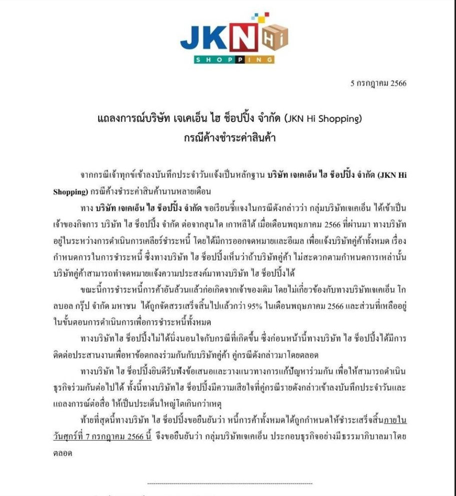 “จากกรณีเจ้าทุกข์เข้าลงบันทึกประจำวันแจ้งเป็นหลักฐาน บริษัท เจเคเอ็น ไฮ ช็อปปิ้ง จำกัด (JKN Hi Shopping) กรณีค้างชำระค่าสินค้านานหลายเดือนทาง บริษัท เจเคเอ็น ไฮ ช็อปปิ้ง จำกัด ขอเรียนชี้แจงในกรณีดังกล่าวว่า กลุ่มบริษัทเจเคเอ็น ได้เข้าเป็นเจ้าของกิจการ บริษัท ไฮ ช็อปปิ้ง จากัด ต่อจากฮุนได เกาหลีใต้ เมื่อเดือนพฤษภาคม 2566 ที่ผ่านมา
