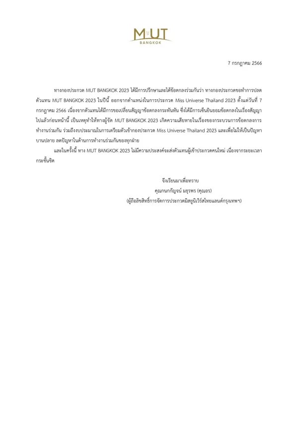 เป็นเหตุทำให้ทางผู้จัด MUT Bangkok 2023 เกิดความเสียหายในเรื่องของกระบวนการข้อตกลงการทำงานร่วมกัน รวมถึงงบประมาณในการเตรียมตัวเข้ากองประกวด Miss Universe Thailand 2023 และเพื่อไม่ให้เป็นปัญหาบานปลาย ลดปัญหาในด้านการทำงานร่วมกันของทุกฝ่าย และครั้งนี้ทาง MUT Bangkok 2023 ไม่มีความประสงค์จะส่งตัวแทนผู้เข้าประกวดคนใหม่ เนื่องจากระยะเวลากระชั้นชิด”