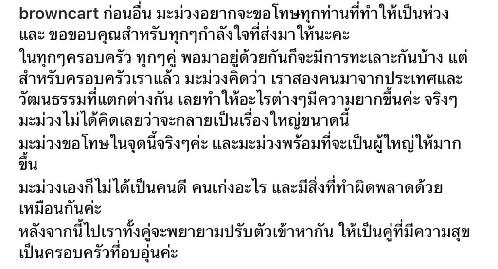 มะม่วงขอโทษในจุดนี้จริงๆ ค่ะ และมะม่วงพร้อมที่จะเป็นผู้ใหญ่ให้มากขึ้น มะม่วงเองก็ไม่ได้เป็นคนดี คนเก่งอะไร และมีสิ่งที่ทำผิดพลาดด้วยเหมือนกันค่ะ หลังจากนี้ไป เราทั้งคู่จะพยายามปรับตัวเข้าหากัน ให้เป็นคู่ที่มีความสุข เป็นครอบครัวที่อบอุ่นค่ะ”