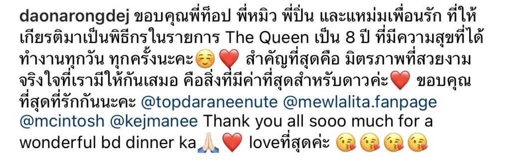 “ขอบคุณพี่ท็อป พี่หมิว พี่ปิ่น และแหม่มเพื่อนรัก ที่ให้เกียรติมาเป็นพิธีกรในรายการ The Queen เป็น 8 ปี ที่มีความสุขที่ได้ทำงานทุกวัน ทุกครั้งนะคะ สำคัญที่สุดคือ มิตรภาพที่สวยงาม จริงใจที่เรามีให้กันเสมอ คือสิ่งที่มีค่าที่สุดสำหรับดาวค่ะ ขอบคุณที่สุดที่รักกันนะคะ