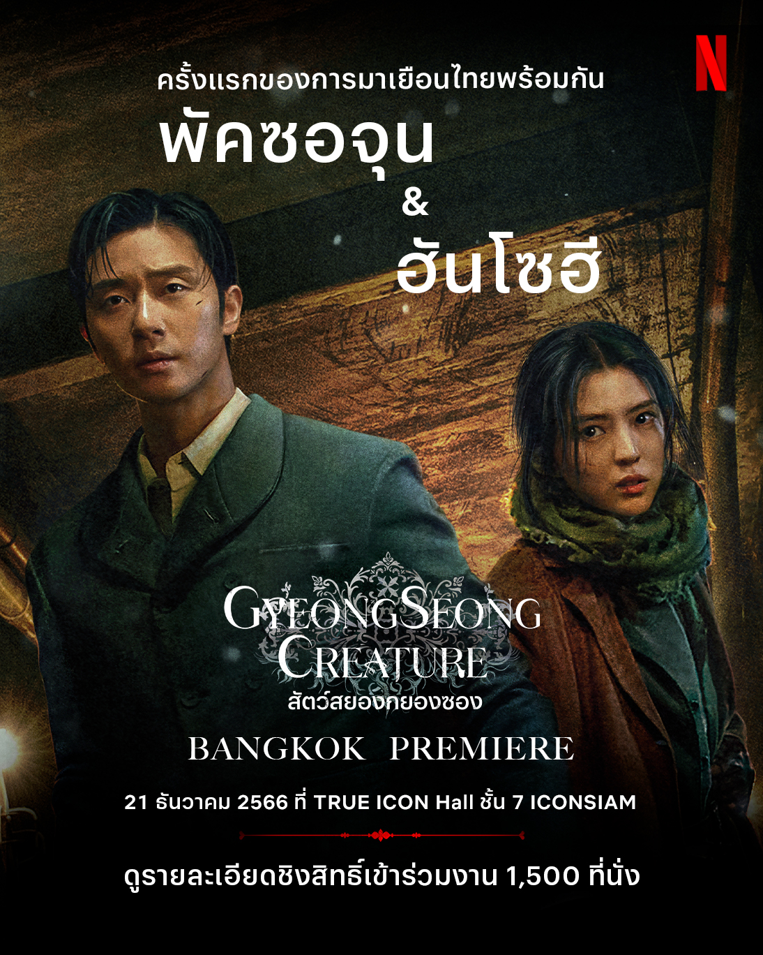 Netflix ประกาศข่าวดีเตรียมพานักแสดงนำและทีมผู้สร้างบินลัดฟ้ามาร่วมกิจกรรมเปิดตัวซีรีส์แบบจัดเต็มในประเทศไทยเป็นครั้งแรก กับงาน Gyeongseong Creature Bangkok Premiere ต้อนรับซีรีส์เกาหลีฟอร์มยักษ์ที่ทุกคนรอคอย สัตว์สยองกยองซอง (Gyeongseong Creature) โดย Netflix ได้เตรียมเนรมิตฤดูใบไม้ผลิใน “กยองซอง” หรืออดีตกรุงโซลในปี 1945 ให้เกิดขึ้นในประเทศไทย พร้อมพานักแสดงเกาหลีระดับซูเปอร์สตาร์ขวัญใจชาวไทยอย่างพัคซอจุนและฮันโซฮีมาพบปะแฟนๆ และร่วมสร้างโมเมนต์สุดประทับใจไปพร้อมๆ กันในวันที่ 21 ธันวาคมนี้ ณ TRUE ICON Hall ชั้น 7 ICONSIAM