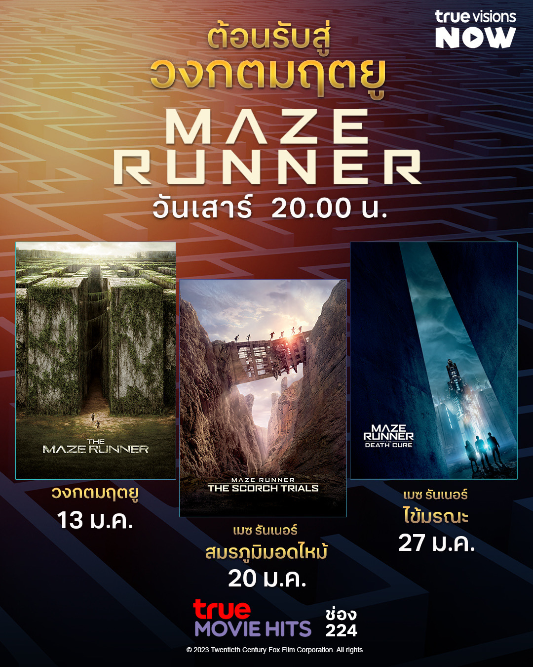 มาร่วมลุ้น และผจญภัยไปกับภาพยนตร์ไตรภาค “THE MAZE RUNNER” (เดอะ เมซ รันเนอร์) ในวันเสาร์ที่ 13, 20 และ 27 มกราคมนี้ ทางทรูวิชั่นส์ และทรูวิชั่นส์ นาว ช่อง True Movie Hits (135, 224) เวลา 20.00 น.