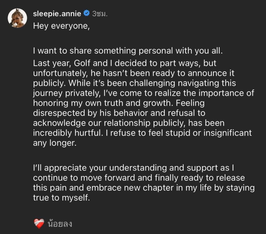 จนกระทั่งล่าสุดทางด้าน “แอนนี่” ได้ออกมาเคลื่อนไหว โพสต์ข้อความว่า เธอและ “กอล์ฟ พิชญะ” ได้เลิกรากันตั้งแต่ปีที่แล้ว แต่ทางฝ่ายชายยังไม่พร้อมที่จะออกมาพูดถึงเรื่องความสัมพันธ์