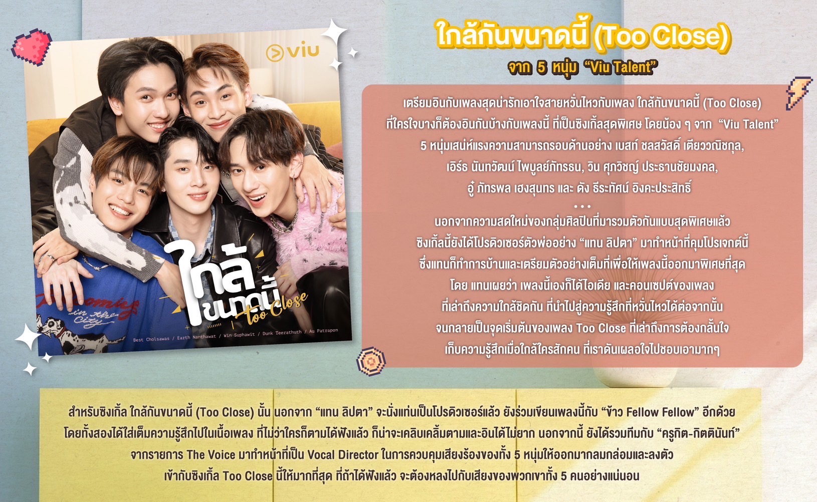 “แทน ลิปตา” นั่งแท่นโปรดิวซ์ซิงเกิ้ลสุดใจหวิว ใกล้ขนาดนี้ (Too Close) จาก 5 หนุ่ม “Viu Talent”