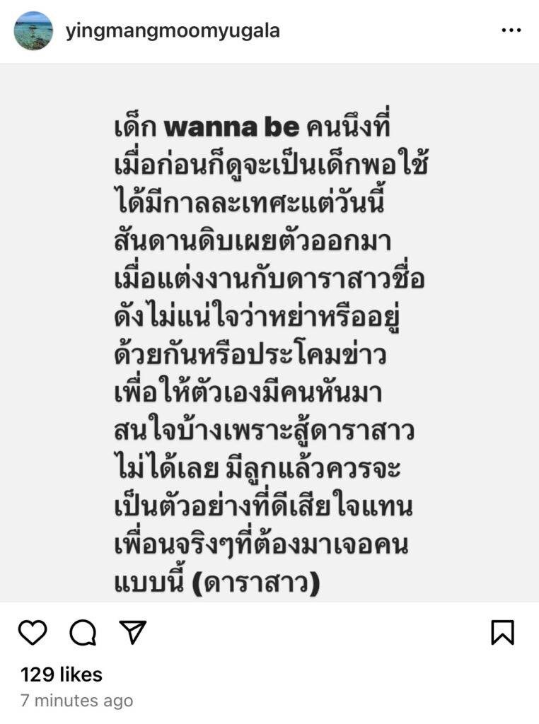 โดยระบุข้อความว่า “เด็ก wanna be คนนึงที่เมื่อก่อนก็ดูจะเป็นเด็กพอใช้ได้ มีกาลละเทศะ แต่วันนี้สันดานดิบเผยตัวออกมา เมื่อแต่งงานกับดาราสาวชื่อดัง ไม่แน่ใจว่าหย่าหรืออยู่ด้วยกันหรือประโคมข่าว เพื่อให้ตัวเองมีคนหันมาสนใจบ้าง เพราะสู้ดาราสาวไม่ได้เลย มีลูกแล้วควรจะเป็นตัวอย่างที่ดี เสียใจแทนเพื่อนจริง ๆ ที่ต้องมาเจอคนแบบนี้ (ดาราสาว)” ท่ามกลางชาวเน็ตเข้ามาคอมเมนต์สนั่นต่างทิ้งอักษรย่อเต็มโลกออนไลน์
