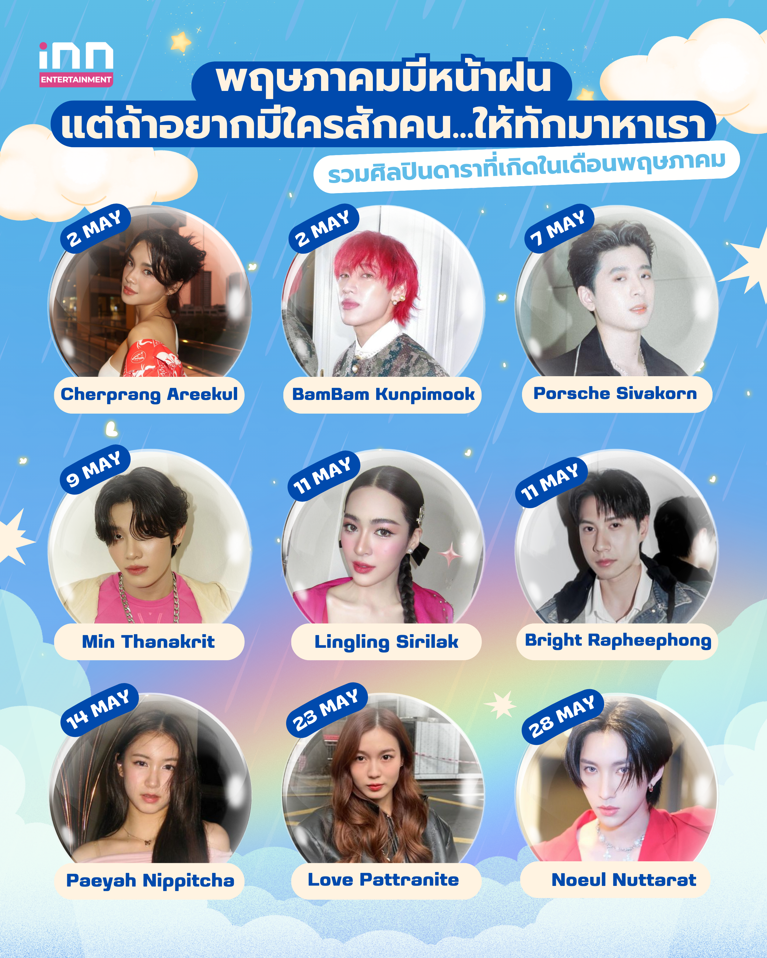 สำหรับ นักแสดง-ศิลปิน ที่เกิดในเดือนพฤษภาคมนี้ ทางเราก็ขอให้ ศิลปิน และ นักแสดงทุกคน มีความสุข มีผลงานปัง ๆ ออกมาให้พวกเราและเหล่าแฟนคลับได้ติดตามกัน และขอให้ทุกคนถูกค้นพบมากขึ้นเรื่อยๆ ขอให้สนุกกับสิ่งที่ทำต่อไปนะ ทางเราพร้อมที่จะซัพพอร์ตพวกคุณเสมอ ขอให้มีวันที่ดีนะ ❤︎