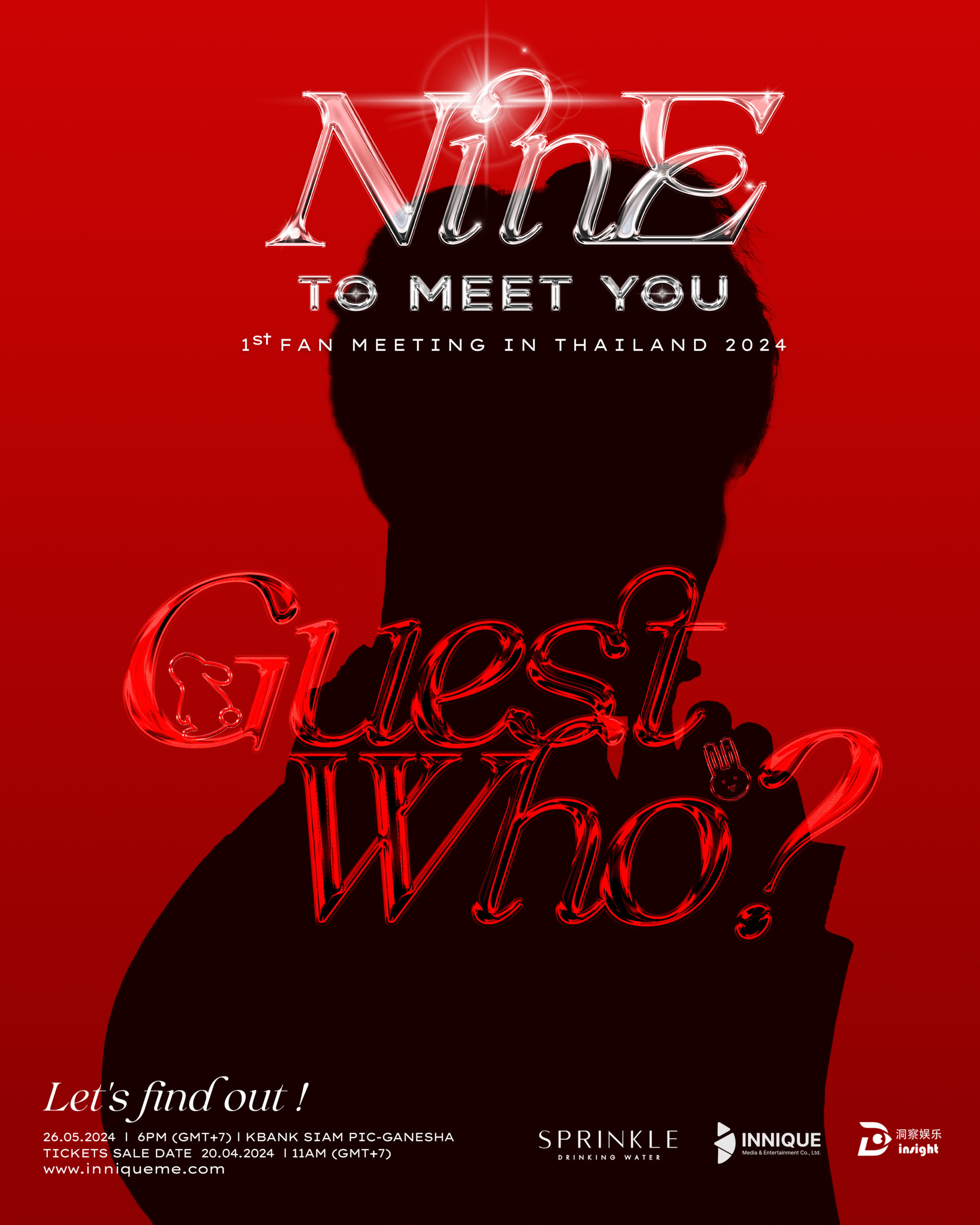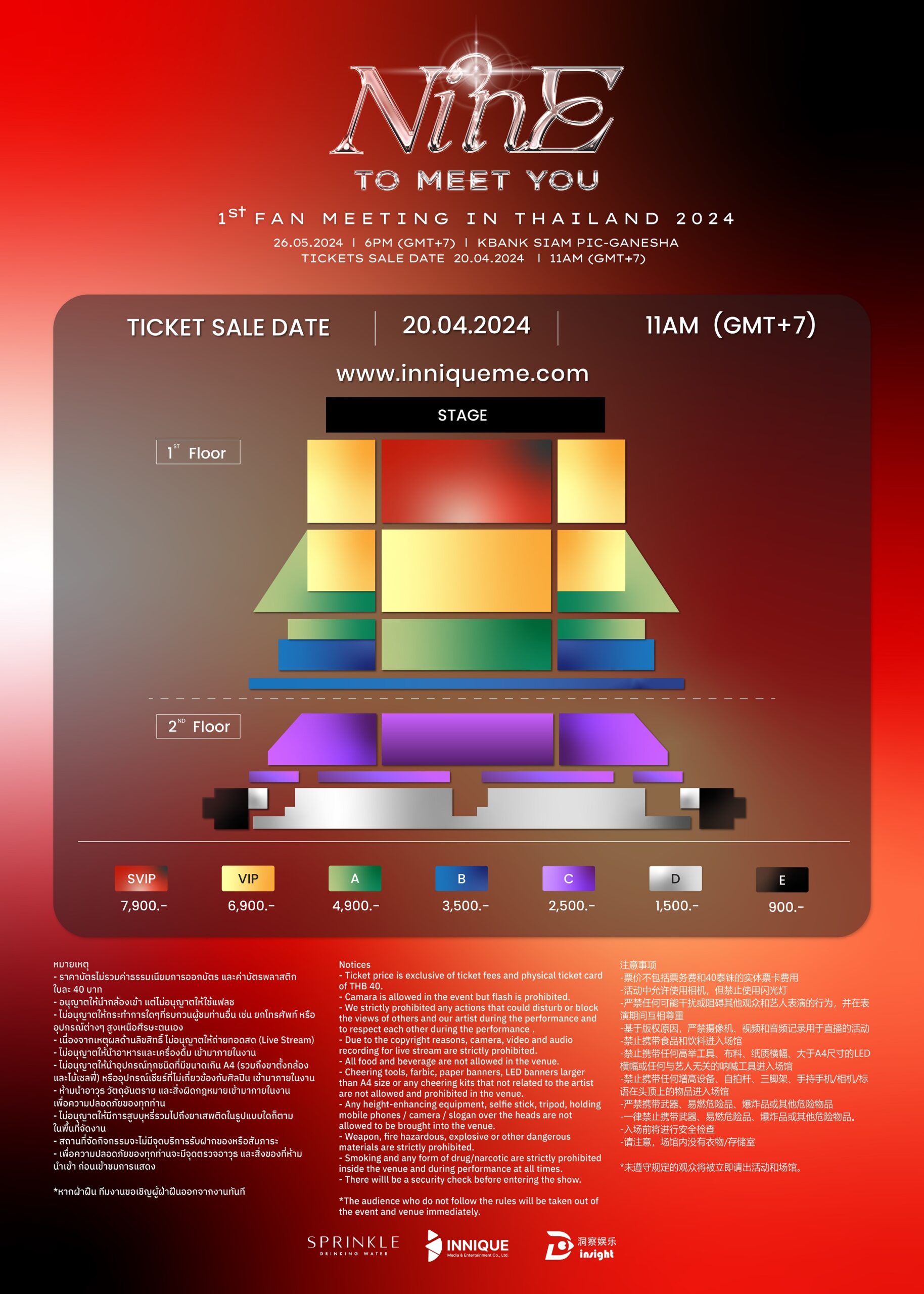 “NINE TO MEET YOU” 1ST FAN MEETING IN THAILAND 2024 จะจัดขึ้นในวันอาทิตย์ที่ 26 พฤษภาคมนี้ เวลา 18.00 น. ณ โรงละคร เคแบงก์ สยามพิฆเนศ ชั้น 7 สยามสแควร์วัน สามารถจองบัตรได้ทาง www.inniqueme.com เท่านั้น ราคา (บัตรนั่งทั้งหมด) 7,900 (SVIP) / 6,900 (VIP) / 4,900 / 3,500 / 2,500 / 1,500 / 900 บาท
