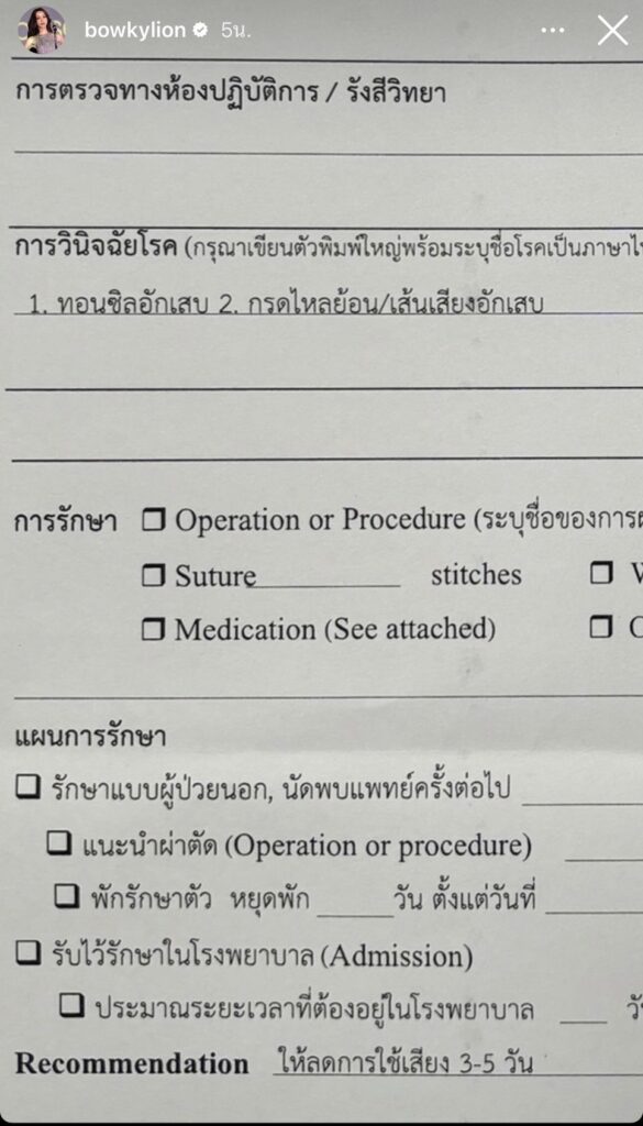 ทั้งนี้สาว “โบกี้” ยังได้ออกมาโพสต์ภาพใบพบแพทย์ลงในไอจีสตอรี่ ท่ามกลางชาวเน็ตเข้ามาส่งกำลังให้สาว “โบกี้” กันอย่างล้นหลาม