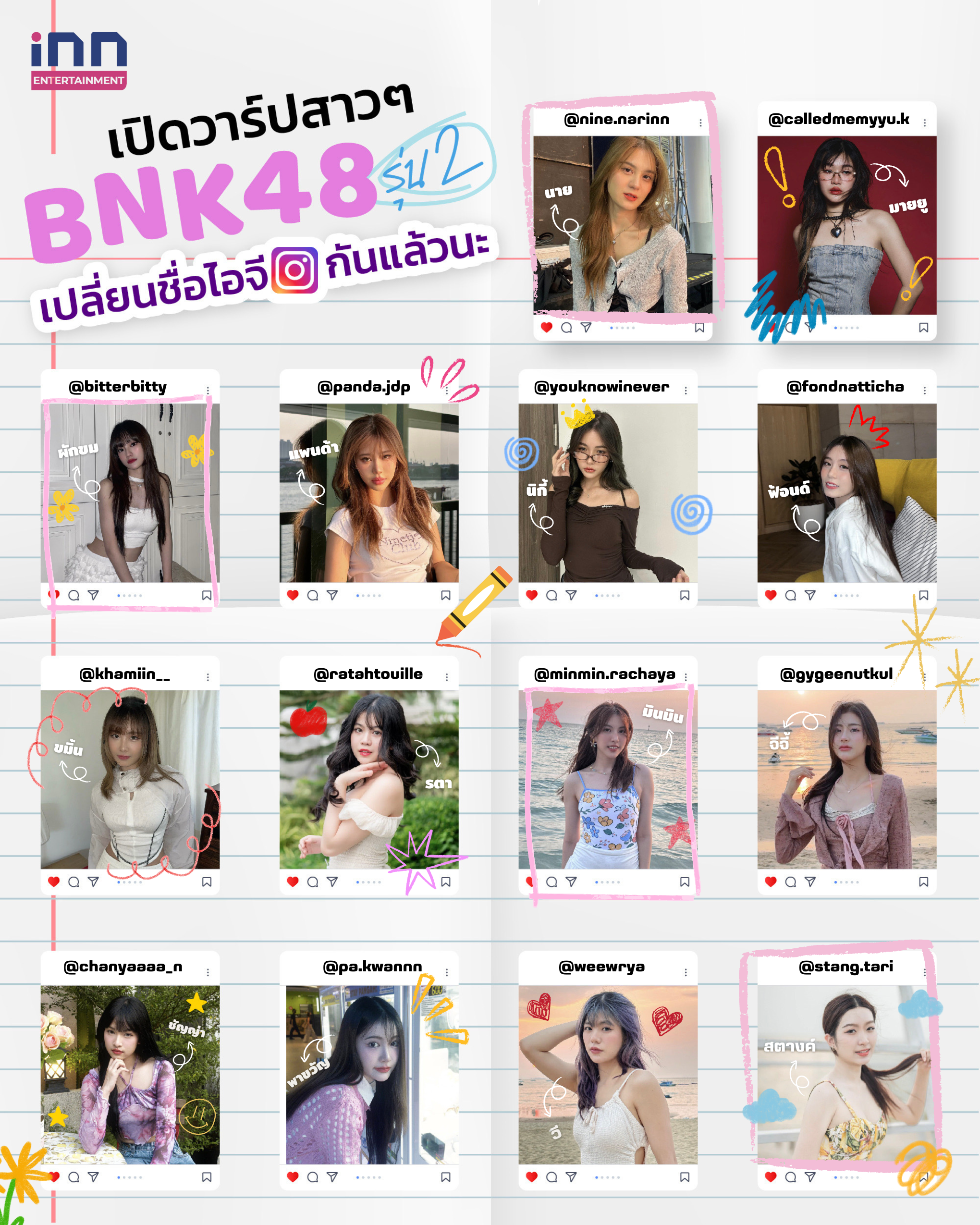 หลังจากที่จบการศึกษาไปได้ไม่นาน กลุ่มสาวๆ BNK48 รุ่นที่ 2 อย่างล่าสุดสาวๆก็ได้เปลี่ยนชื่อ Instagram กันรัวๆ จนแฟนๆพากันแซวเพราะแต่ละชื่อบ่งบอกคาแรกเตอร์แต่ละคนได้ ชนิดที่เรียกได้ว่าบางคนชื่อครีเอทและบอกสไตล์ตัวเองชัดเจนมากๆ ว่าแต่สาวๆเปลี่ยนชื่อเป็นชื่ออะไร? สามารถติดตามช่องทางไหนได้บ้าง …วันนี้ไอเอ็นเอ็นจะพามาเปิดวาร์ปไอจีสาวๆกัน !