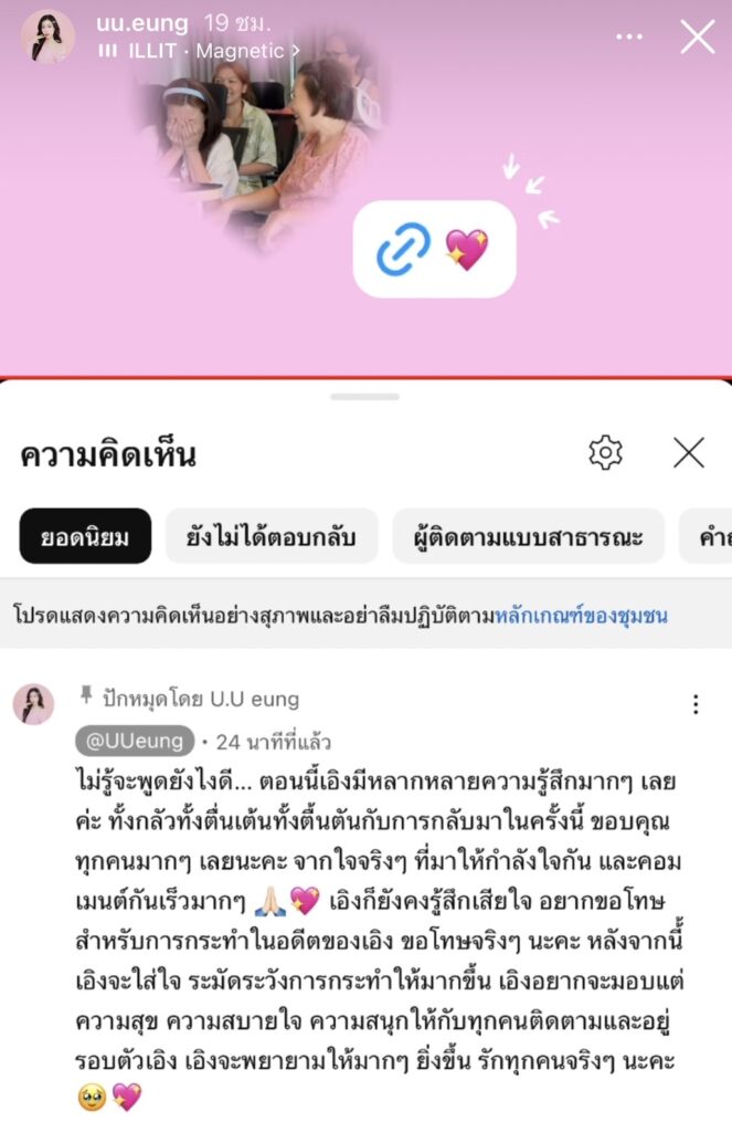 โดยสาว “อุงเอิง” ได้ออกมาโพสต์ข้อความว่า “ไม่รู้จะพูดยังไงดี… ตอนนี้เอิงมีหลากหลายความรู้สึกมากๆ เลยค่ะ ทั้งกลัวทั้งตื่นเต้นทั้งตื้นตันกับการกลับมาในครั้งนี้ ขอบคุณทุกคนมากๆ เลยนะคะ จากใจจริงๆ ที่มาให้กำลังใจกัน และคอมเมนต์กันเร็วมากๆ เอิงก็ยังคงรู้สึกเสียใจ อยากขอโทษ สำหรับการกระทำในอดีตของเอิง ขอโทษจริงๆ นะคะ หลังจากนี้้เอิงจะใส่ใจ ระมัดระวังการกระทำให้มากขึ้น เอิงอยากจะมอบแต่ความสุข ความสบายใจ ความสนุกให้กับทุกคนติดตามและอยู่รอบตัวเอิง เอิงจะพยายามให้มากๆ ยิ่งขึ้น รักทุกคนจริงๆ นะคะ 🥹”