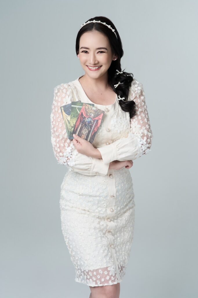 ทั้งนี้พอช่วง Covid-19 มีบางอย่างเกี่ยวกับงานที่ทำให้เรารู้สึกแย่ หมดคุณค่าในตัวเอง บวกกับว่างมากขึ้นด้วย ก็เลยลองหยิบไพ่สำรับแรกที่เรียนดูดวงเมื่อปี 2557 ออกมาทำนาย ก็รู้สึกว่าไพ่คุยกับเราหรือให้คำตอบที่ฮีลใจเรามากเลยเริ่มเช็คดวงฟรีให้กับ Followers ใน Tiktok แล้วก็ทำเรื่อยมา ซึ่งการเป็นนักพยากรณ์ยุคนี้มีความสนุกขึ้น ไม่ได้ดูงมงายโบราณ ก็เลยเริ่มเปิดตัวกับคนทั่วไป ส่วนงานแสดงและพิธีกรก็ยังรับอยู่ปกติเหมือนเดิมค่ะ”