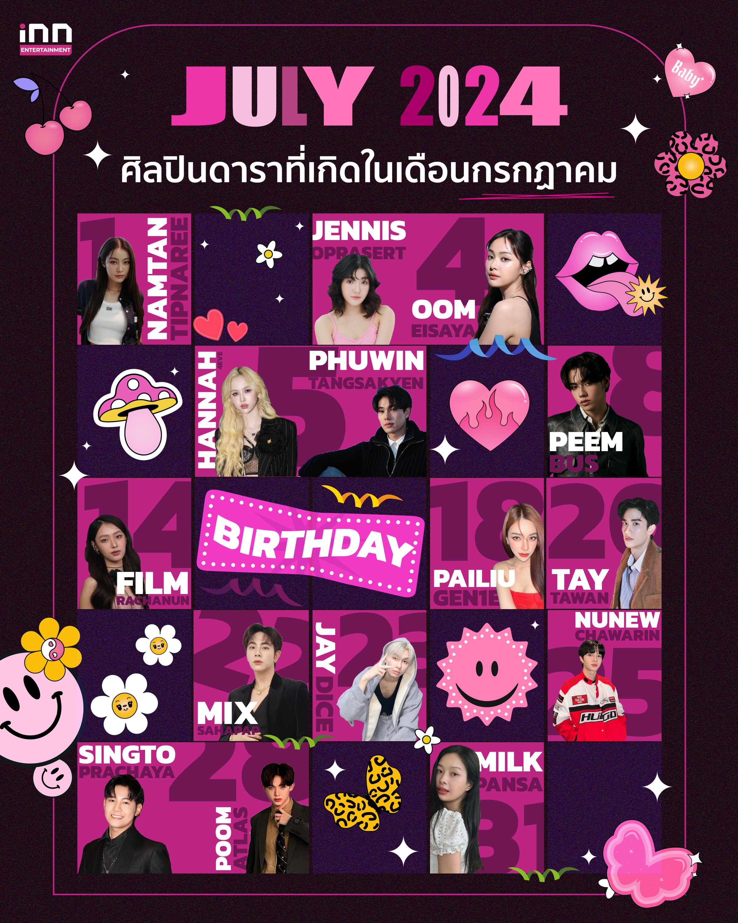 สำหรับ นักแสดง-ศิลปิน ที่เกิดในเดือนกรกฎาคมนี้ ทางเราก็ขอให้ ศิลปิน และ นักแสดงทุกคน มีความสุข มีผลงานปัง ๆ ออกมาให้พวกเราและเหล่าแฟนคลับได้ติดตามกัน และขอให้ทุกคนถูกค้นพบมากขึ้นเรื่อยๆ ขอให้สนุกกับสิ่งที่ทำต่อไปนะ ทางเราพร้อมที่จะซัพพอร์ตพวกคุณเสมอ ขอให้มีวันที่ดีนะ ❤︎