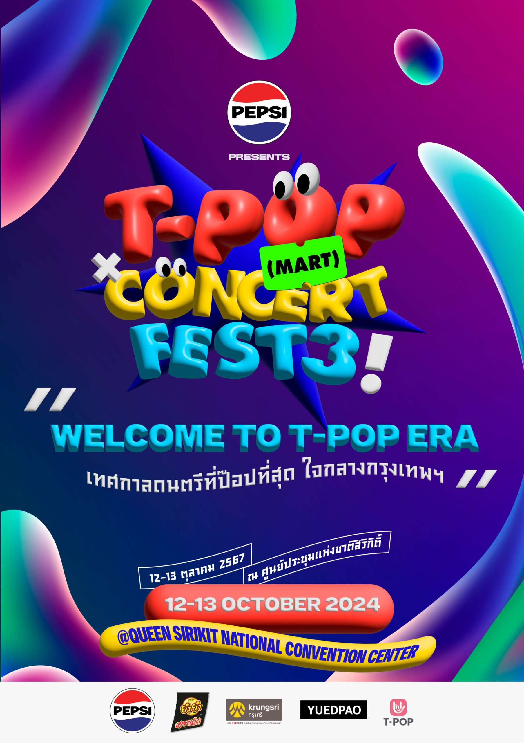 โดย T-POP(mart) Concert Fest 3 จะจัดขึ้นในวันที่ 12-13 ตุลาคม 2567 ณ ศูนย์ประชุมแห่งชาติสิริกิติ์ ถือเป็นคอนเสิร์ต 2024 ใจกลางเมืองกรุงเทพที่ต้องเดินทางไปรับชมให้ได้
