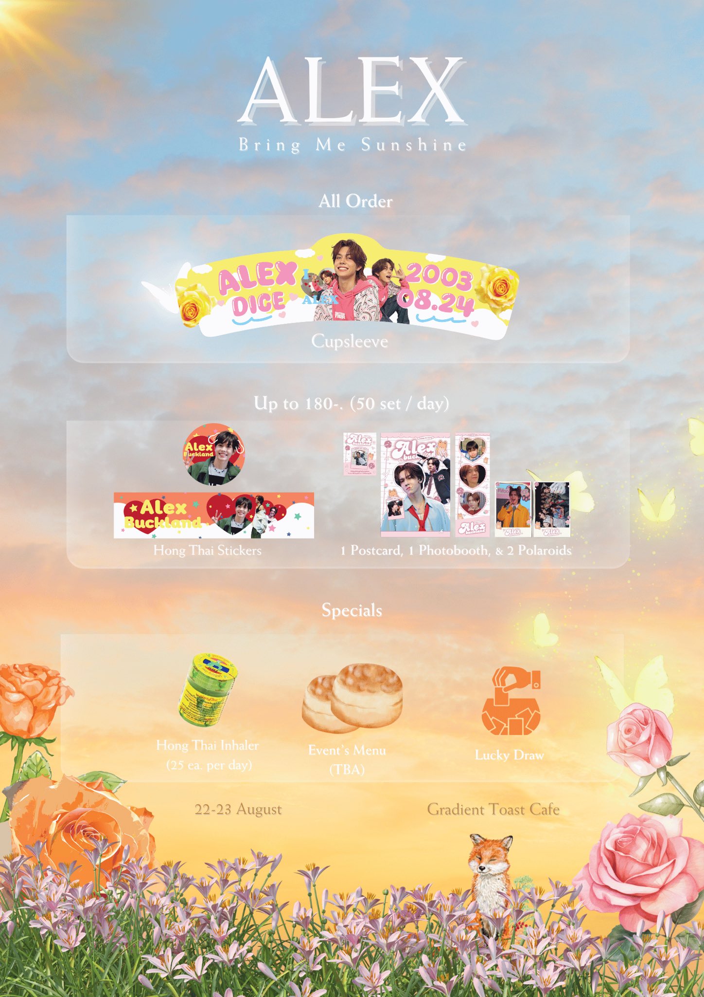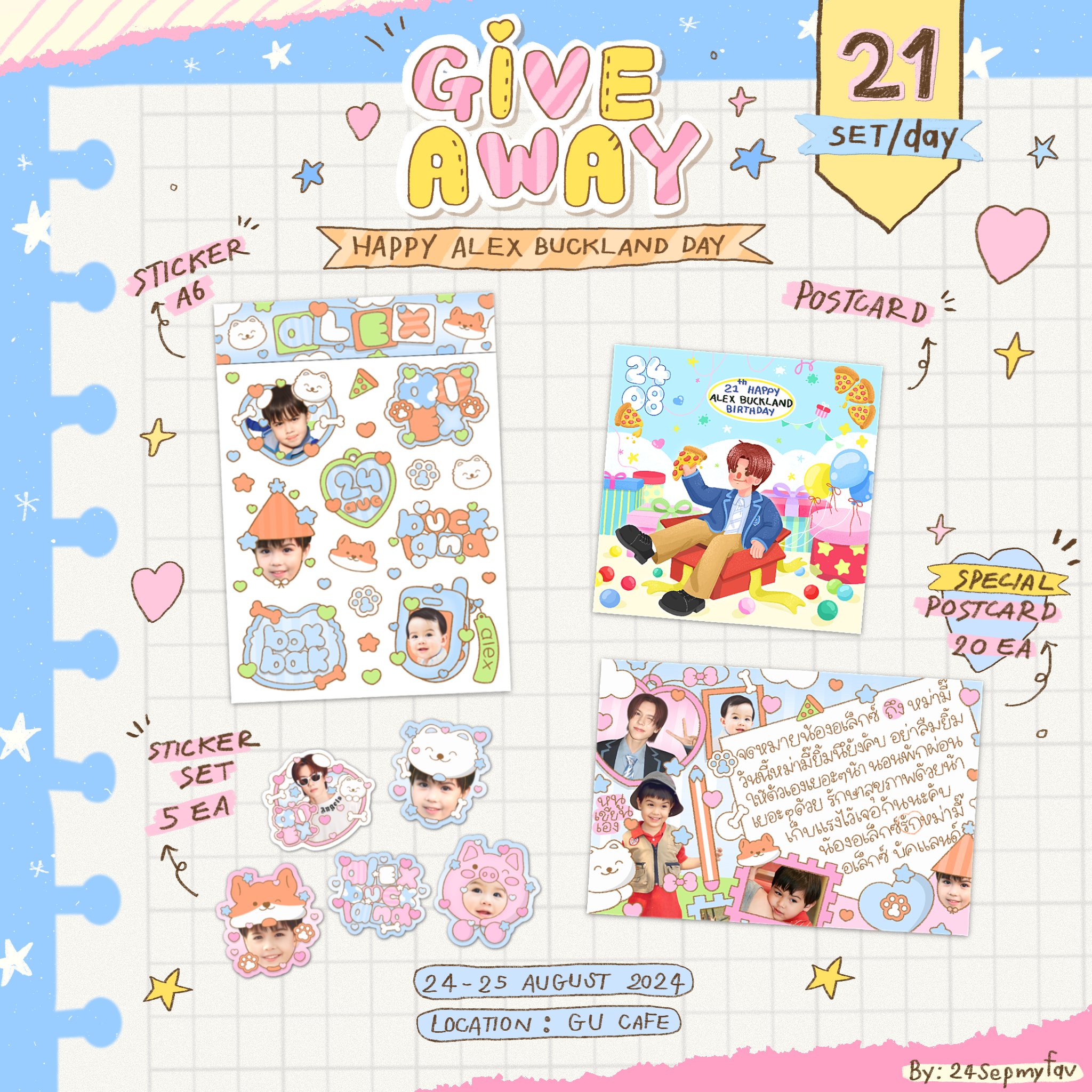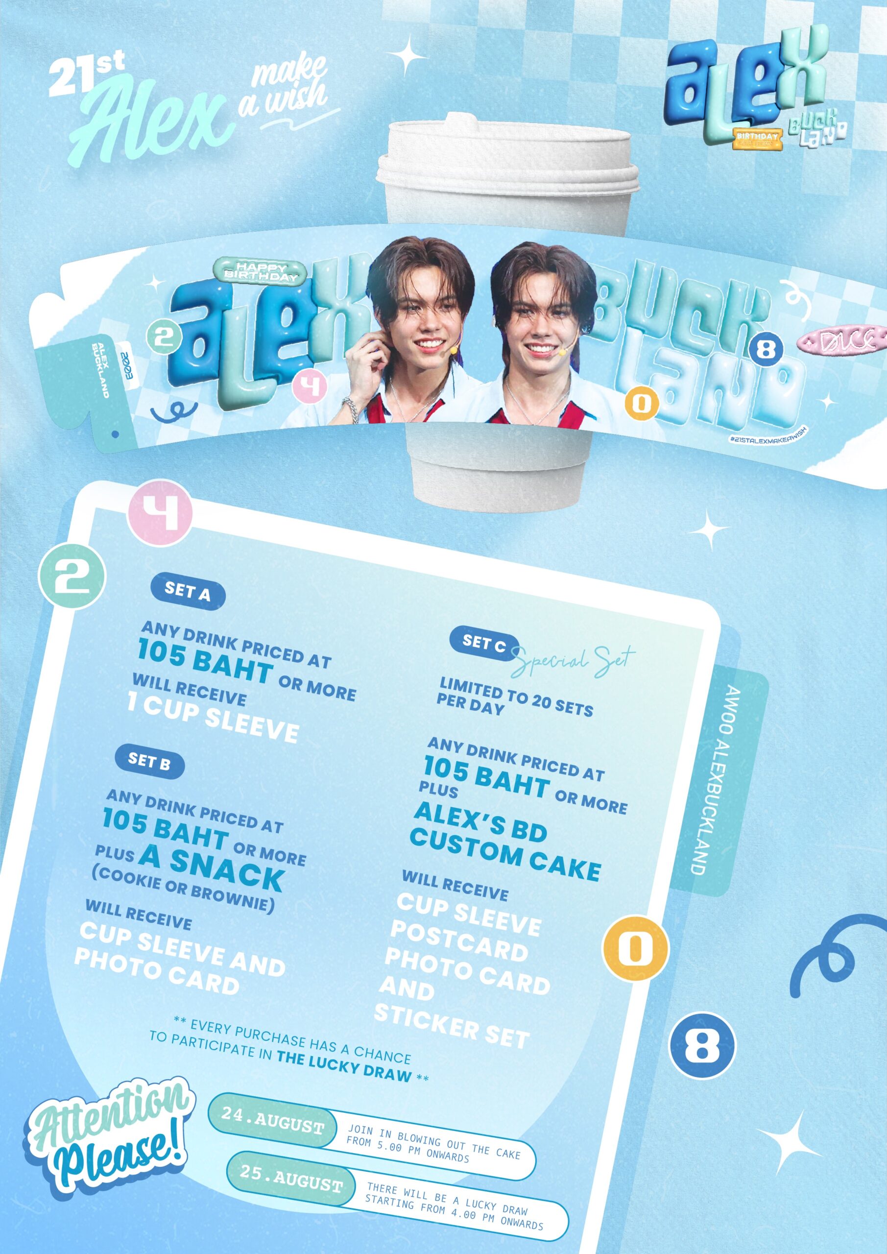 : ซื้อเครื่องดื่มราคา 105 บาทขึ้นไป พร้อม ALEX’S BD custom cake ได้รับ cup sleeve, postcard, photocard, sticker set