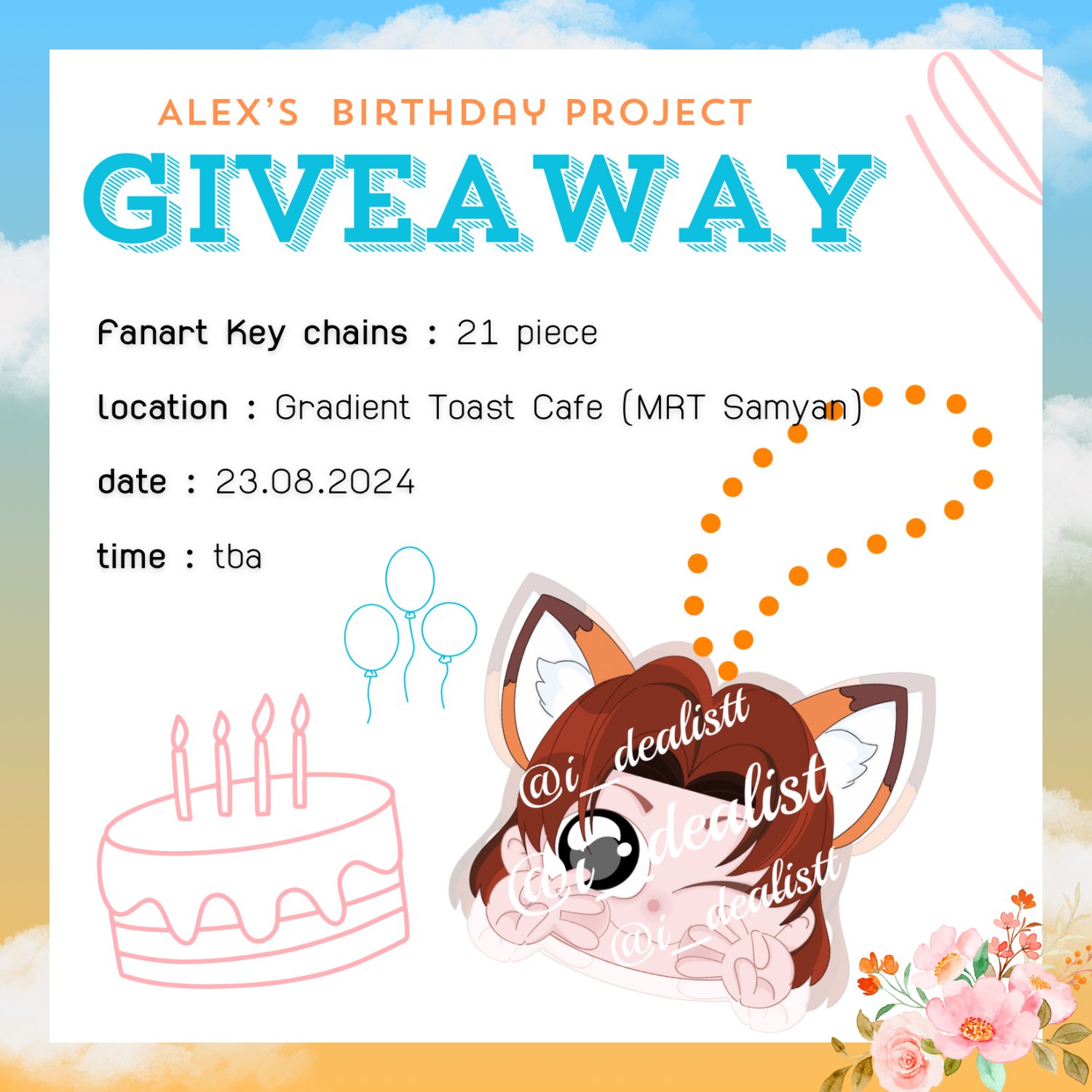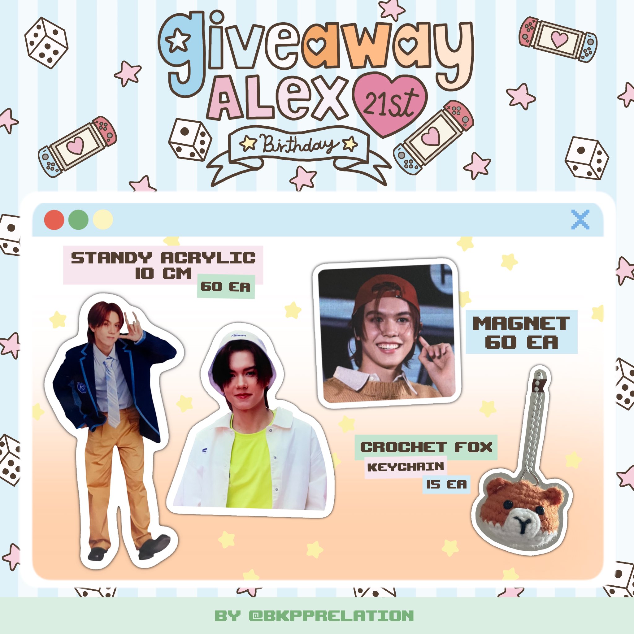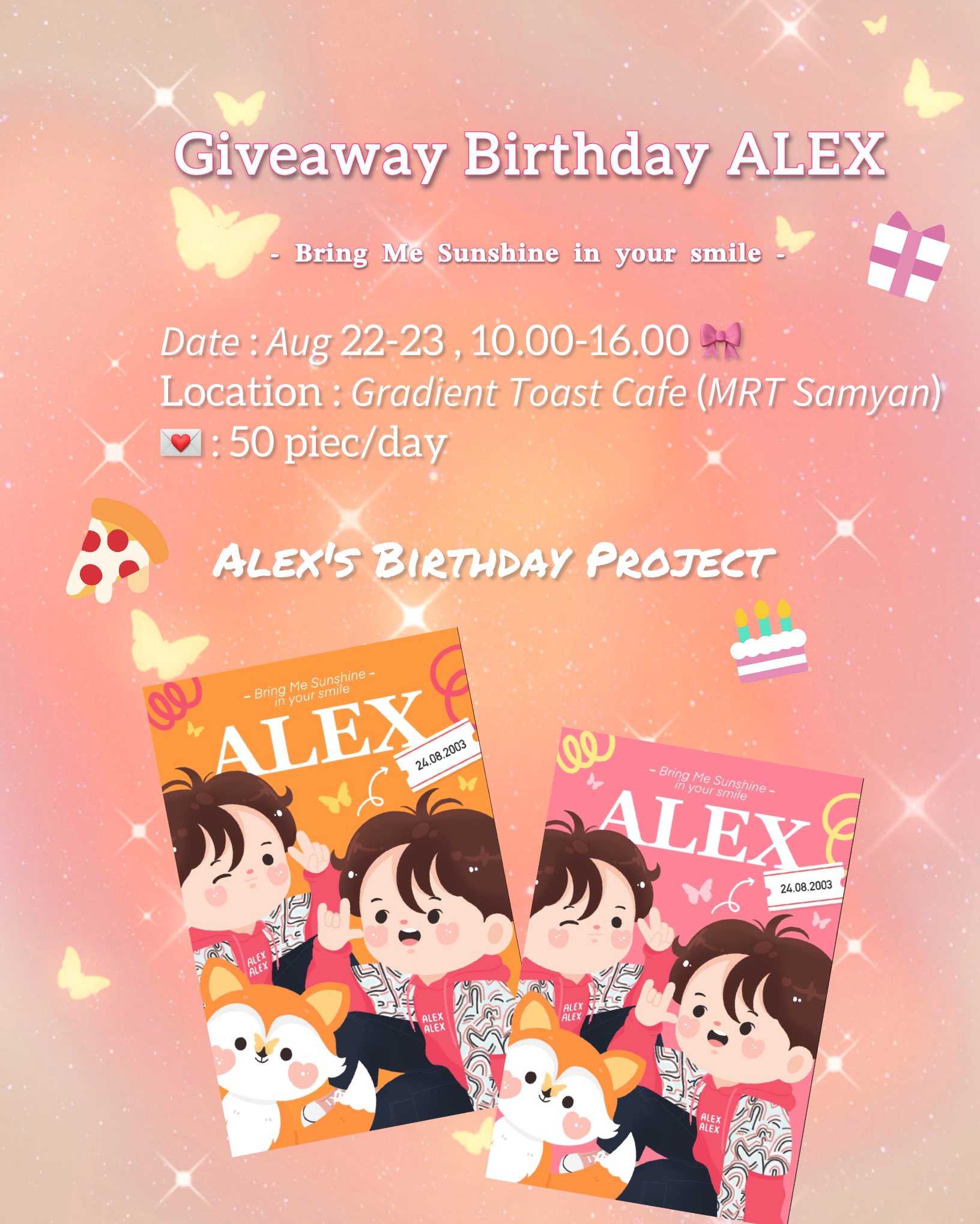 มาต่อกันเลยกับกิจกรรมแจกของ Give Away และโปรเจกต์สุดน่ารัก (บางส่วนเท่านั้น) จากเหล่าแฟนคลับที่มอบให้น้องอเล็กซ์ ซึ่งทางเราได้แอบไปส่องมา เห็นของแต่ละอย่างน่ารักๆทั้งนั้น จนอยากได้ไว้เองเลยยย ทางเราจะแปะลิงค์ต้นทางไว้ให้ อยากให้ทุกคนได้ดูความน่ารักของแฟนๆ และรู้จักน้องอเล็กซ์มากขึ้นผ่านสิ่งที่ทุกคนทำ ขออนุญาตทุกคนด้วยนะคะ