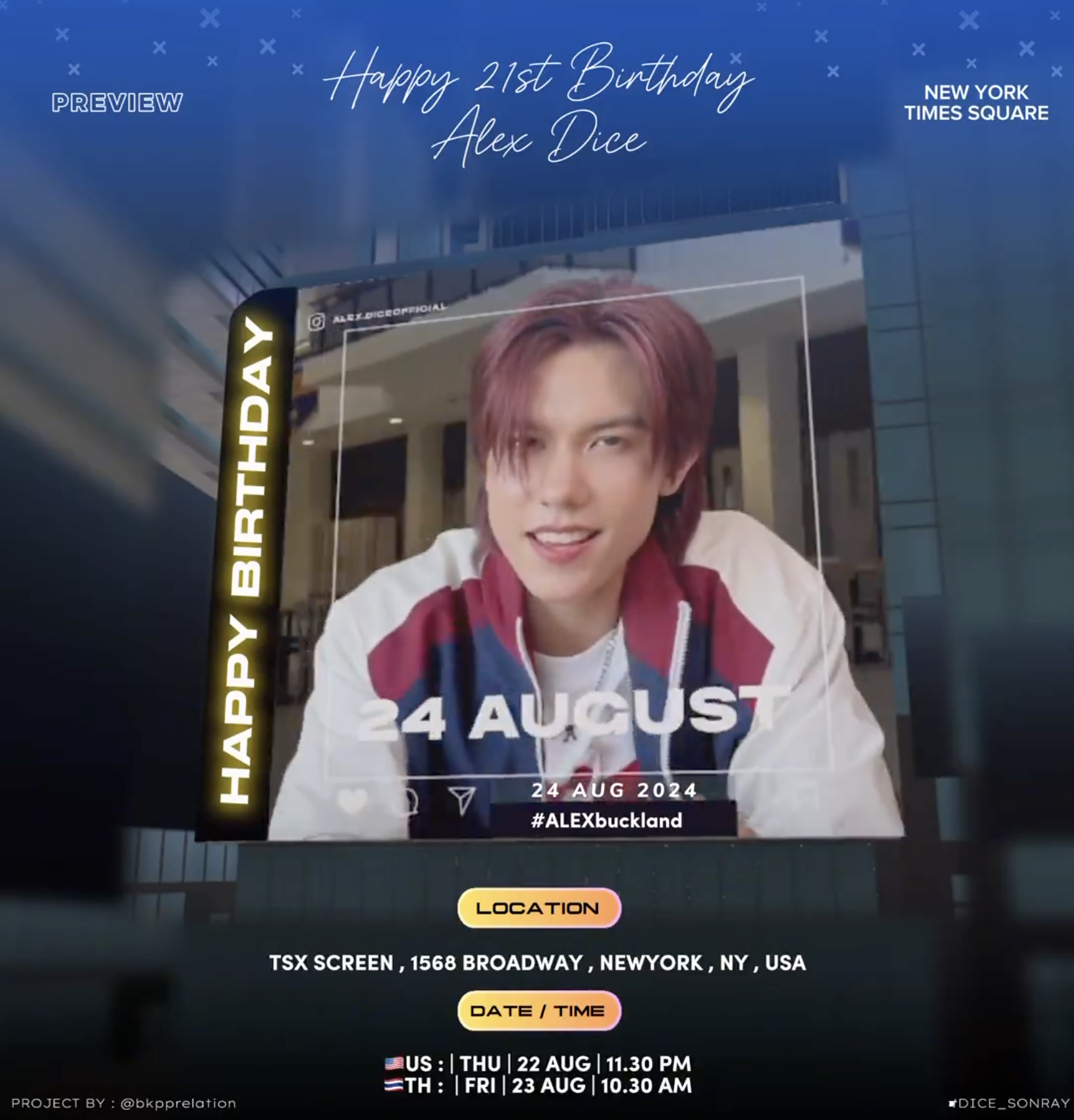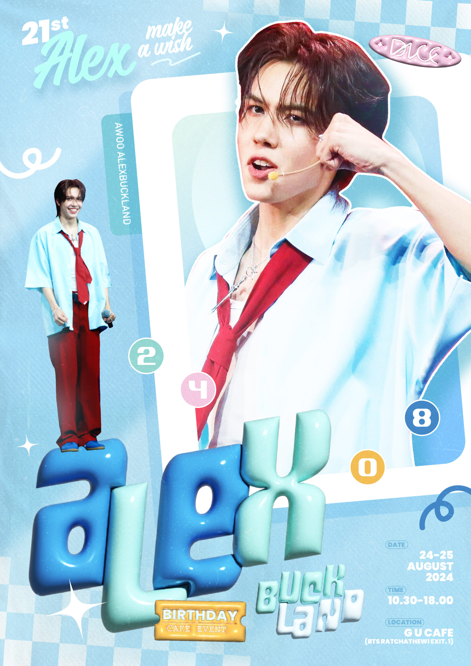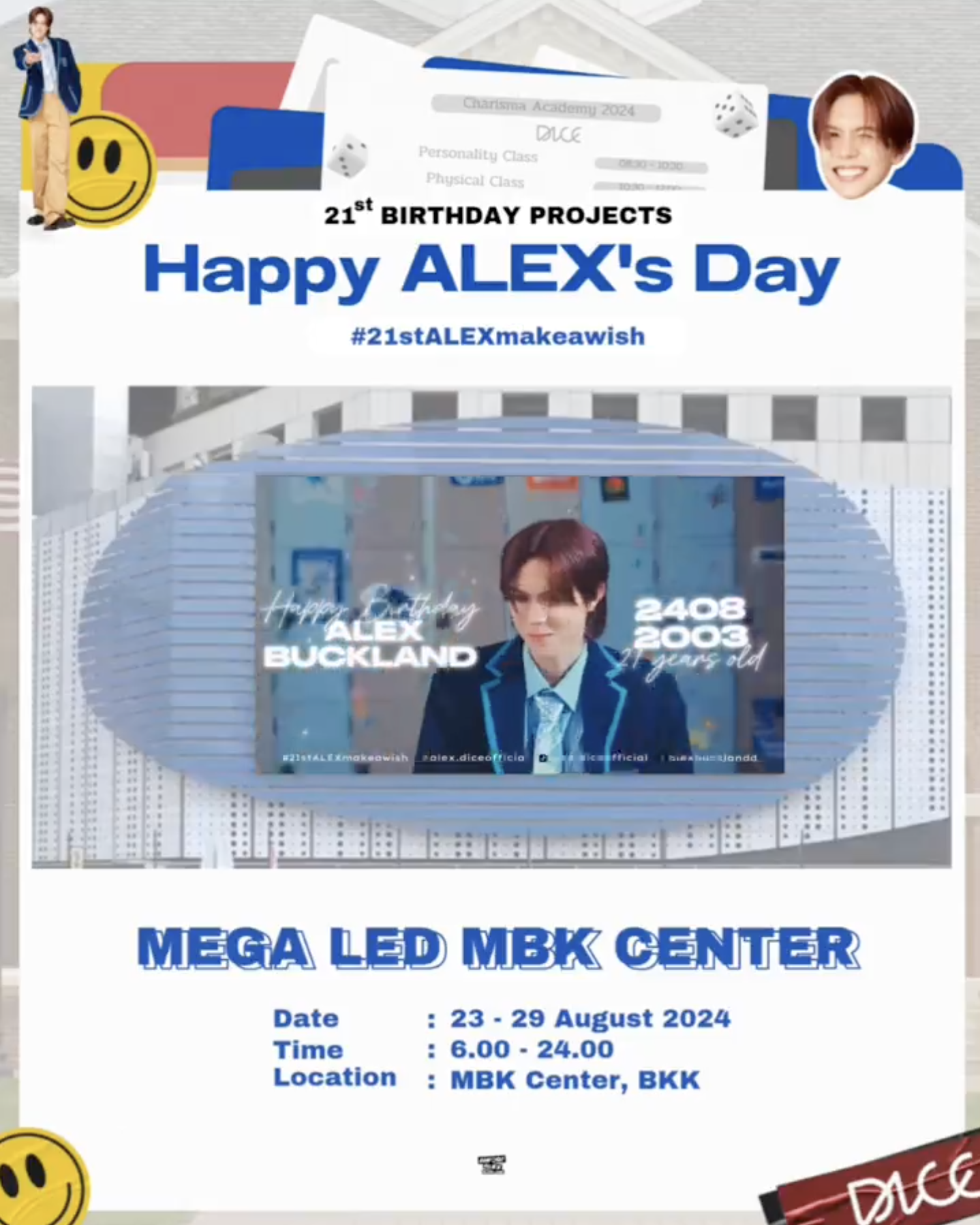 24 สิงหาคม 2567 ร่วมอวยพรวันเกิดให้กับศิลปินคนโปรด อเล็กซ์ – อเล็กซานเดอร์ บัคแลนด์ หรือ อเล็กซ์ DICE เนื่องในโอกาสครบรอบวันเกิด 21 ปี ของไอ้ต้าวบ๊อกแบ๊กที่จริงใจของพี่แอดมิน และนอกจากน้องอเล็กซ์ของเราจะเติบโตขึ้น วันเกิดปีนี้ เหล่า Prize (รางวัลของ DICE) ก็มีเซอร์ไพรส์ กับโปรเจกต์วันเกิดให้เขาคนนี้ด้วย