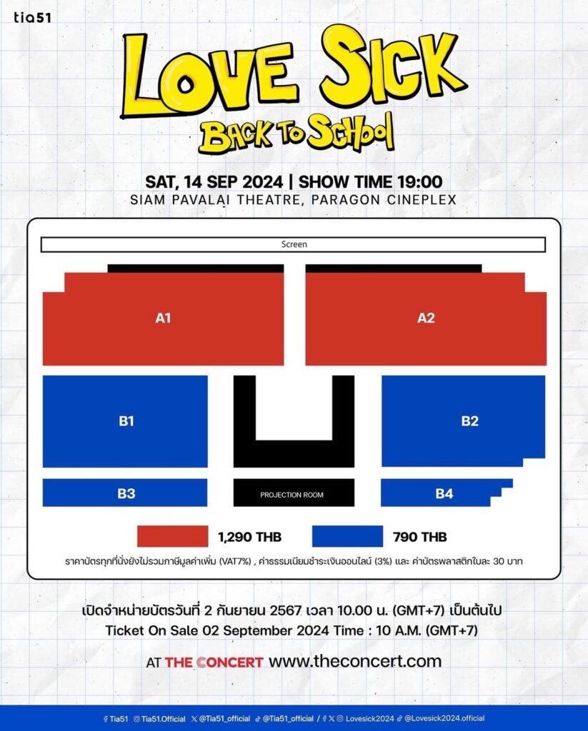 โดยในวันที่ 14 กันยายน 2567 ทางบริษัท Tia 51 ผู้ผลิต “LoveSick 2024” ได้เตรียมจัดงาน “LoveSick Back to School” รับชมโชว์สุดพิเศษและ LoveSick 2024 Episode 1 พร้อมกับนักแสดงก่อนใคร ในโรงภาพยนตร์สยามภาวลัย พารากอน ซีนีเพล็กซ์ โดยเริ่มเปิดจำหน่ายบัตรในวันที่ 2 กันยายน 2567 เวลา 10:00 น. ที่ The Concert https://www.theconcert.com วอร์มนิ้วให้พร้อม เหลาดินสอให้คม แล้วเจอกัน!