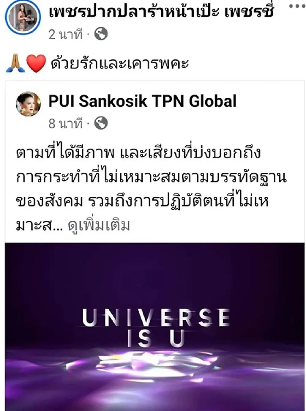 ทำเอาวงการนางงามช็อกไม่น้อย เมื่อทางด้านปุ้ย ปิยาภรณ์ ผู้ถือครอง TPN Global ซึ่งหนึ่งในนั้นคือเวทีประกวด“Universe Is U” เวทีประกวดนางงามไม่จำกัดเพศ ได้ออกมาประกาศปลดเพชร กมุทมาศ หรือ เพชร ปากปลาร้าหน้าเป๊ะ รอง 4 Universe is U 2024” เนื่องจากมีพฤติกรรมไม่เหมาะสม กรณีไลฟ์สดโชว์เสียงคล้ายมีซัมติงกับหนุ่มรายหนึ่ง ว่อนโลกออนไลน์
