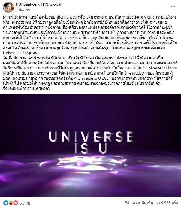 ดิฉัน นางปิยาภรณ์ แสนโกศิก ในฐานะประธานองค์กร ขอแจ้งปลด คุณเพชร กมุทมาศ รองชนะเลิศอันดับ 4 Universe Is U 2024 ออกจากตำแหน่งดังกล่าว นับจากบัดนี้เป็นต้นไป และขอให้นำมงกุฎ และสายสะพาย คืนกลับมายังกองประกวดภายใน 3วัน นับจากวันนี้ค่ะ จึงแจ้งมาเพื่อทราบโดยทั่วกัน
