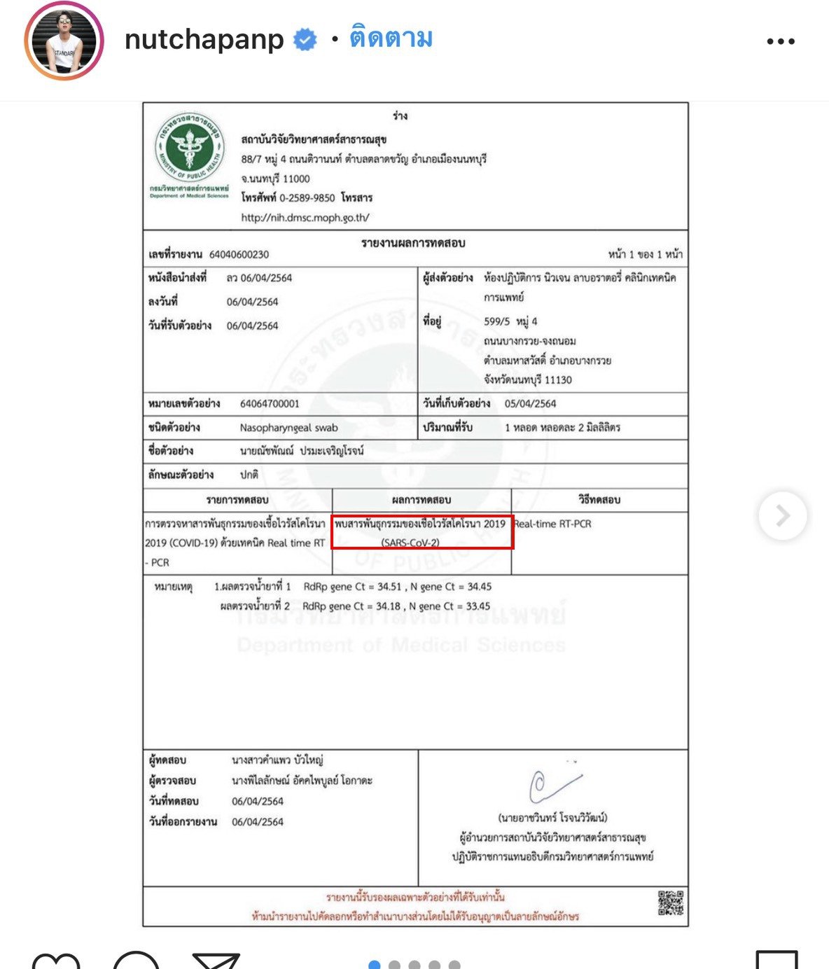 หนักแสดงหนุ่ม ปีโป้ ณัชพัณณ์ ได้ออกมาชี้แจงผ่านอินทราแกรมส่วนตัว @nutchapanp ระบุว่า หลังจากที่โป้ได้ออกมาแจ้งถึงความเสี่ยงในการติดเชื้อ COVID-19 ไปก่อนหน้านี้ ตอนนี้ผลการตรวจหาเชื้อของโป้ออกมาเป็น Positive/Detected (ติดเชื้อ COVID-19) นะครับ