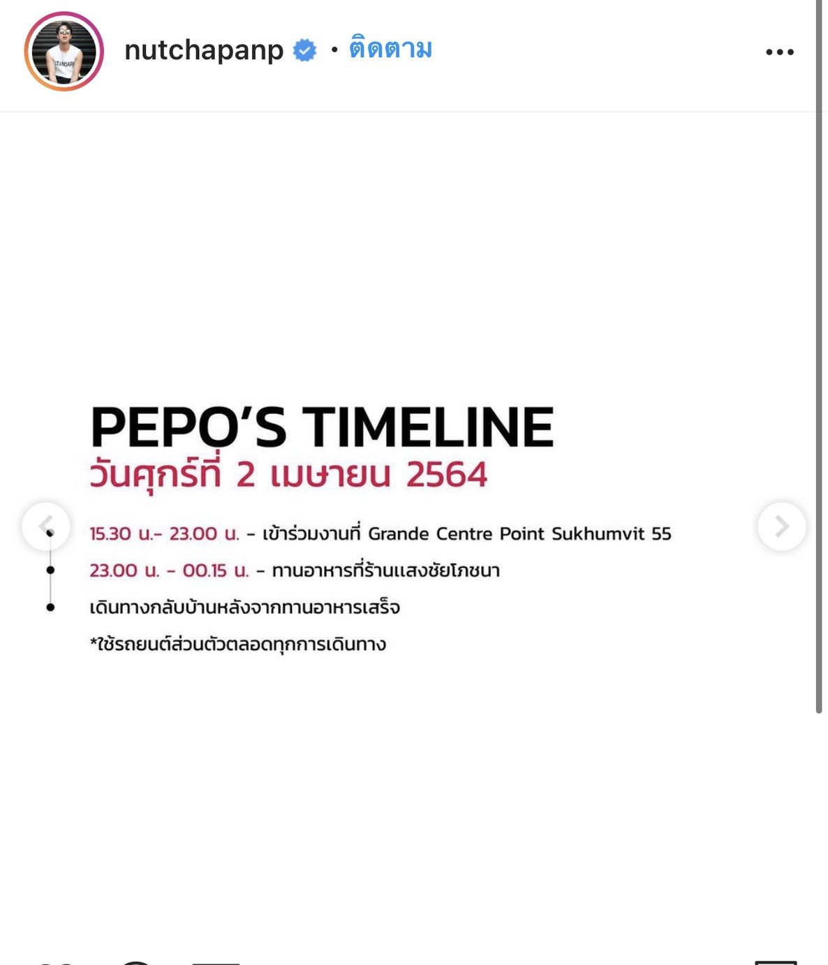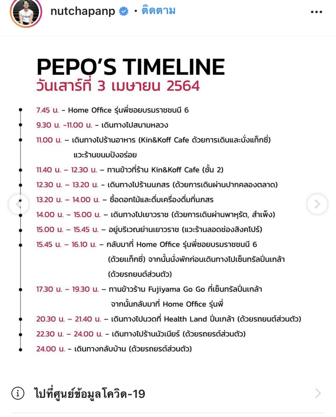 พอทราบผลโป้เลยรีบลิสต์ไทม์ไลน์ของโป้ตั้งแต่วันที่ได้พบกับผู้ติดเชื้อ COVID-19 (2 เมษายน 64) จนถึงเมื่อวานนี้ (5 เมษายน 64) เพื่อแจ้งให้ทุกคนทราบและระมัดระวังตัวกันก่อนเพื่อความรวดเร็ว ส่วนวันนี้ (6 เมษายน 64) โป้ได้มีเดินทางไปที่โรงพยาบาลกรุงเทพเมื่อเวลา 13.00-14.30 น. เพียงที่เดียวและเดินทางกลับบ้านทันทีโดนเดินทางด้วยรถยนต์ส่วนตัวทั้งหมดครับ