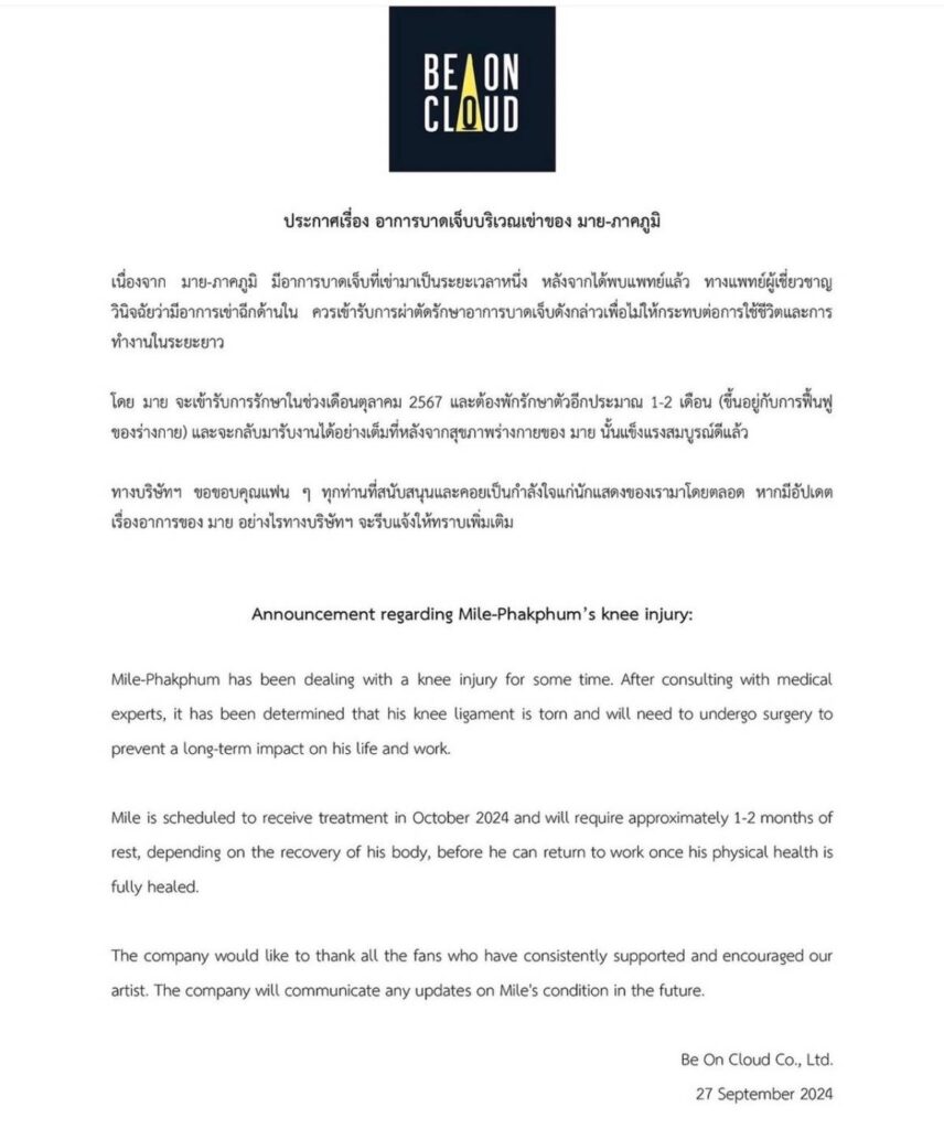 ทำเอาแฟนคลับแห่เป็นห่วง และส่งกำลังใจให้แบบรั่วๆ สำหรับนักแสดงหนุ่มมาย ภาคภูมิที่กำลังจะเข้ารับการผ่าตัดที่เข่าเนื่องจากมีอาการบาดเจ็บ โดยทางต้นสังกัดได้ร่อนจดหมายประกาศว่า