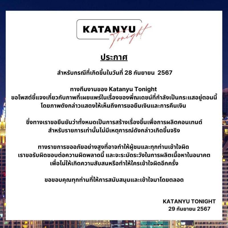 ขณะเดียวกันทางด้านรายการ Katanyu Tonight” ก็ได้ออกสาชี้แจงว่า “รายการ Katanyu Tonight ขอชี้แจงและขอโทษเกี่ยวกับประเด็นรูปภาพที่กำลังเป็นกระแสของ ณเดชน์ คูกิมิยะ และ ทีมงานของรายการ สำหรับกรณีที่เกิดขึ้นในวันที่ 28 กันยายน 2567 ทางทีมงานของ Katanyu Tonight ขอโพสต์ชี้แจงเกี่ยวกับภาพที่เผยแพร่ ในเรื่องของพี่ณเดชน์ที่กำลังเป็นกระแสอยู่ตอนนี้ โดยภาพดังกล่าวแสดงให้เห็นถึงการขอยืมเงินและการคืนเงิน ซึ่งทางเราขอยืนยันว่าทั้งหมดเป็นการสร้างเรื่องขึ้น เพื่อการผลิตคอนเทนต์สำหรับรายการเท่านั้น ไม่มีเหตุการณ์ดังกล่าวเกิดขึ้นจริง ทางรายการขออภัยอย่างสูงที่อาจทำให้ผู้ชมและทุกท่านเข้าใจผิด เราขอรับผิดชอบต่อความผิดพลาดนี้ และจะระมัดระวังในการผลิตเนื้อหาในอนาคต เพื่อไม่ให้เกิดความสับสนหรือทำให้ใครเข้าใจผิดอีกครั้ง ขอขอบคุณทุกท่านที่ให้การสนับสนุนและเข้าใจมาโดยตลอด”
