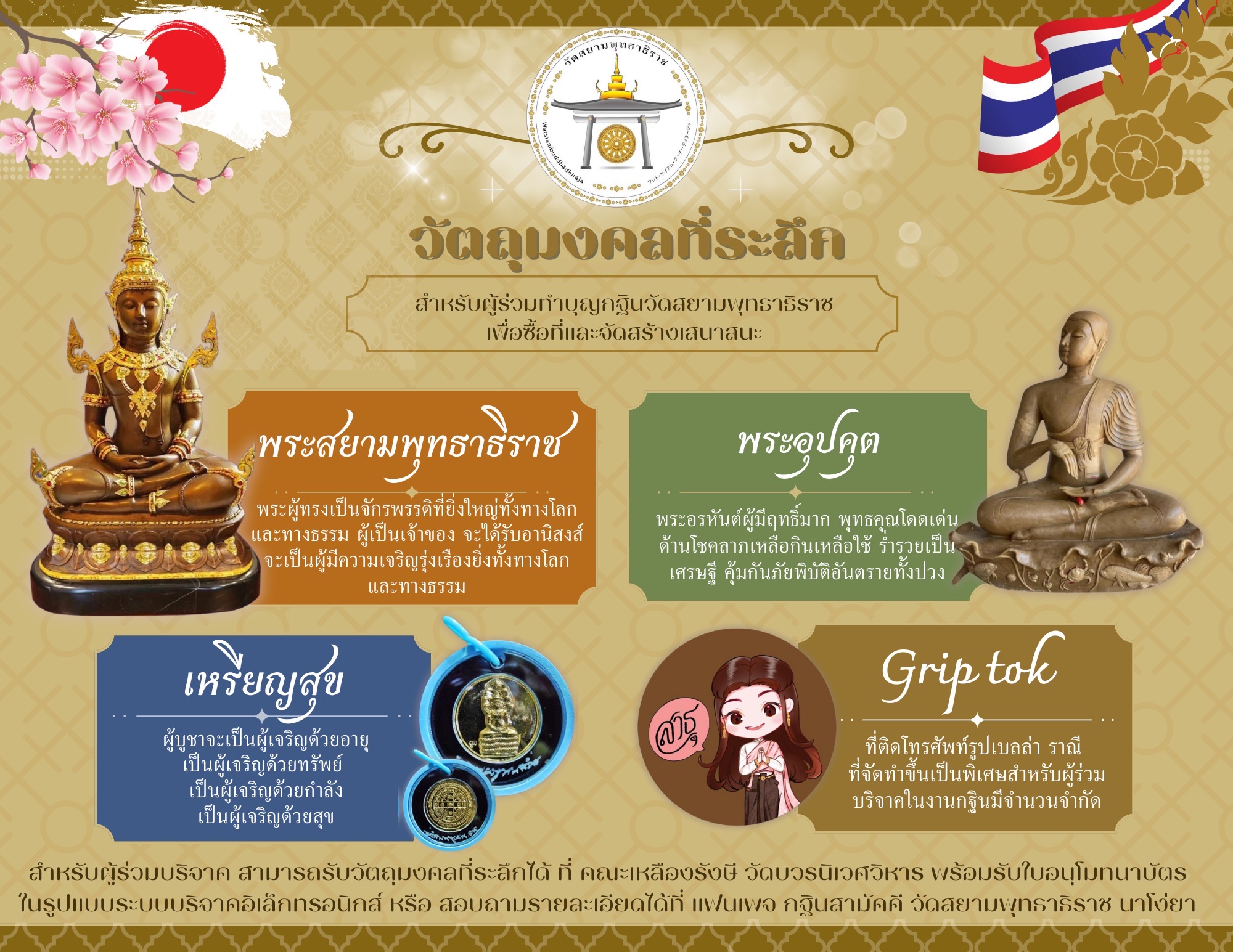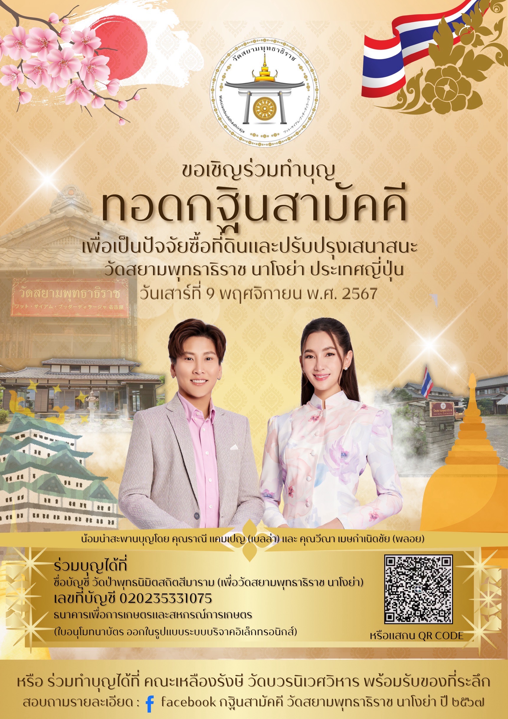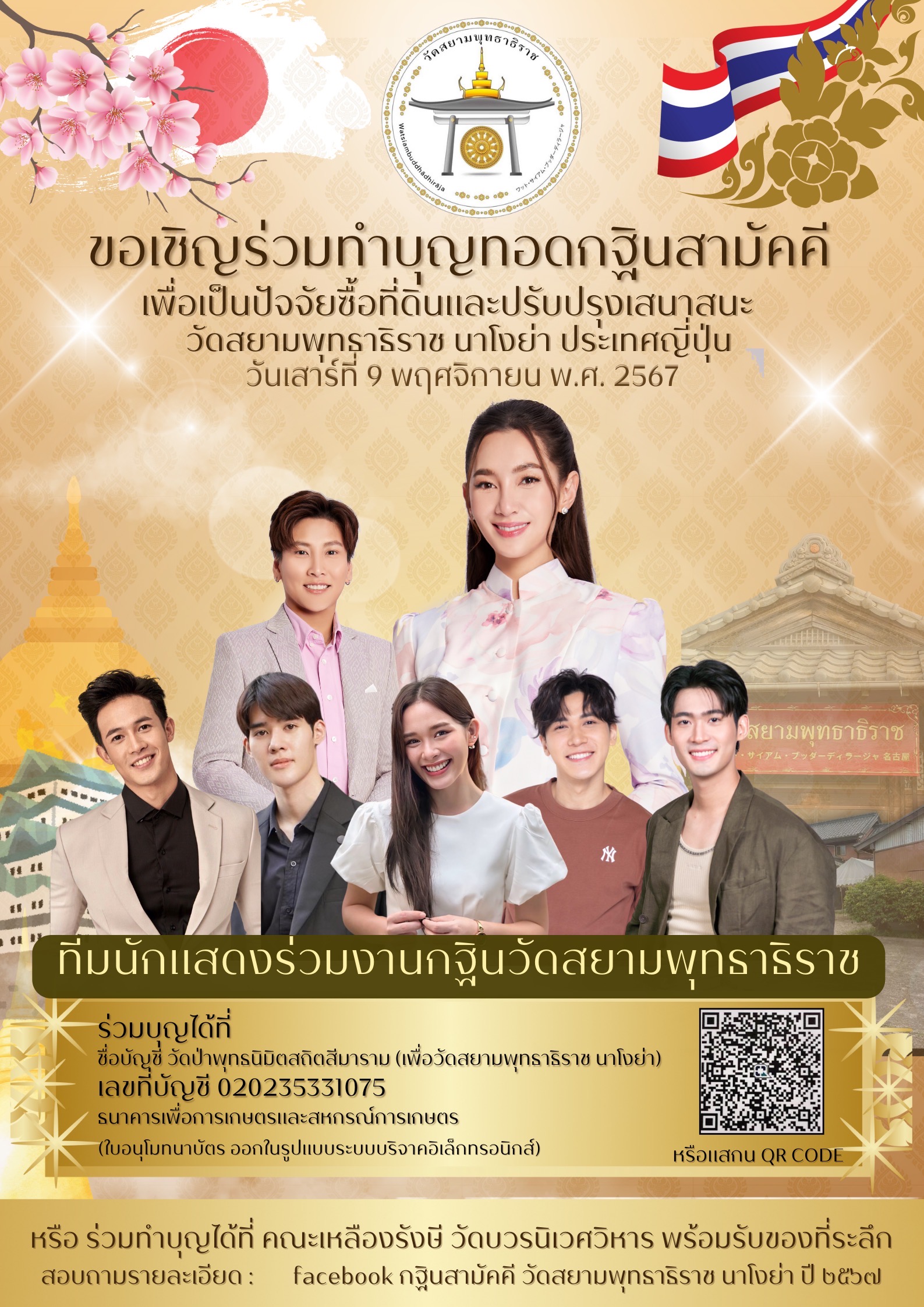 ร่วมบุญได้ที่ ชื่อบัญชี วัดป่าพุทธนิมิตสถิตสีมาราม (เพื่อวัดสยามพุทธาธิราช นาโงย่า) เลขที่บัญชี 020235331075 ธนาคารเพื่อการเกษตรและสหกรณ์การเกษตร ผู้มีจิตศรัทธาสามารถร่วมบุญได้ ตั้งแต่วันนี้จนถึงวันศุกร์ที่ 8 พฤศจิกายน เวลา 16.30 น. หลังจากนั้นจะทำปิดยอดบัญชีและนำปัจจัยทั้งหมดถวายร่วมบุญกฐินสามัคคีในครั้งนี้