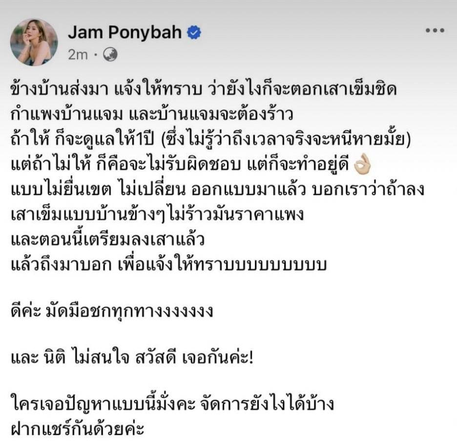 เรียกว่าปัญหาเพื่อนบ้านเกิดขึ้นได้ทุกที่ เช่นเดียวกับนักร้องสาว “แจม ชรัฐฐา หรือ แจม เนโกะจัมพ์” ที่ได้ออกมาโพสต์แชร์ประสบการณ์เพื่อนบ้าน พร้อมขอวิธีแนะนำว่าต้องจัดการยังไง โดยโพสต์ภาพ เอกสารจากบริษัทผู้รับเหมาก่อสร้างของเพื่อนบ้าน ขอเข้าสำรวจพื้นที่บ้านเพื่อต่อเติมอาคาร พร้อมข้อความว่า